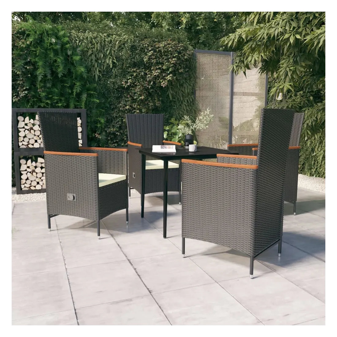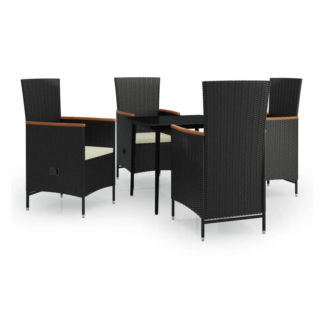Cet élégant ensemble de salle à manger de jardin est destiné à être le point de mire de votre jardin ou patio ! C'est un excellent choix pour les repas en plein air ou pour vous détendre dans l'espace extérieur ! Les cadres en acier enduit de poudre rendent la table et les chaises robustes et stables pour une utilisation quotidienne à l'extérieur. Grâce à la résine tressée résistante à l'eau, les chaises sont faciles à nettoyer et résistantes à l'usure. Le dossier peut être ajusté en tirant sur le bouton sur le côté. Grâce à leur construction légère, elles sont faciles à déplacer. Les coussins de siège bien rembourrés ajoutent également un confort supplémentaire. Les housses en polyester nécessitant peu d'entretien peuvent être retirées et lavées. De plus, le dessus de table en verre lisse est facile à nettoyer avec un chiffon humide et parfait pour ranger des repas, des boissons et d'autres articles décoratifs. Remarque : afin de prolonger la durée de vie des meubles d'extérieur, nous vous recommandons de les protéger avec une housse imperméable.