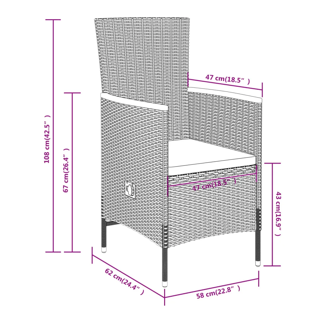 - Dimensions de la chaise (non inclinées) : 58 x 62 x 108 cm (l x P x H)
