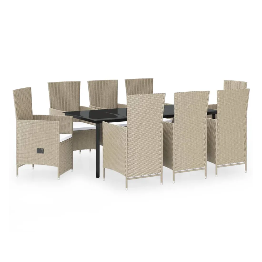 Cet élégant ensemble de salle à manger de jardin est destiné à être le point de mire de votre jardin ou patio ! C'est un excellent choix pour les repas en plein air ou pour vous détendre dans l'espace extérieur ! Les cadres en acier enduit de poudre rendent la table et les chaises robustes et stables pour une utilisation quotidienne à l'extérieur. Grâce à la résine tressée résistante à l'eau, les chaises sont faciles à nettoyer et résistantes à l'usure. Le dossier et le repose-pied peuvent être ajustés en tirant sur le bouton sur le côté. Grâce à leur fabrication légère, elles sont faciles à déplacer. Les coussins de siège bien rembourrés ajoutent également un confort supplémentaire. Les housses en polyester nécessitant peu d'entretien peuvent être retirées et lavées. De plus, le dessus de table en verre lisse est facile à nettoyer avec un chiffon humide et parfait pour ranger repas, boissons et autres articles décoratifs. Remarque : afin de prolonger la durée de vie des meubles d'extérieur, nous vous recommandons de les protéger avec une housse imperméable.