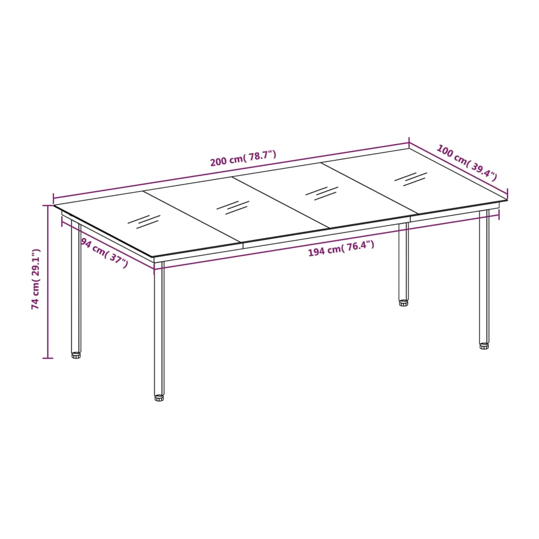 - Dimensions de la table : 200 x 100 x 74 cm (L x l x H)