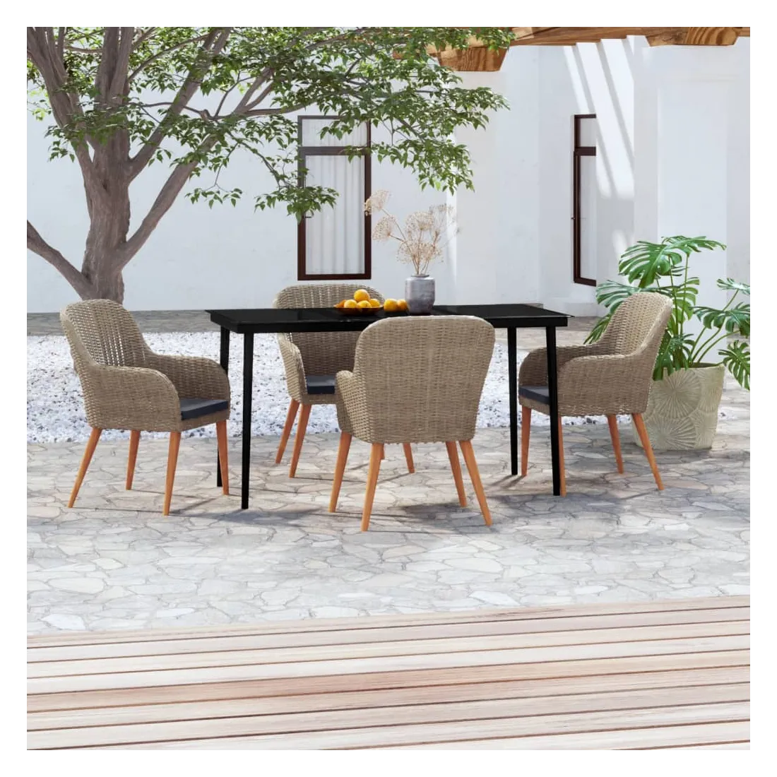 Cet élégant ensemble de salle à manger de jardin est destiné à être le point de mire de votre jardin ou patio ! C'est un excellent choix pour les repas en plein air ou pour vous détendre dans l'espace extérieur ! Les cadres en acier endui de poudre rendent la table et les chaises solides et stables pour une utilisation quotidienne en extérieur. Grâce à la résine tressée résistante à l'eau, les chaises sont faciles à nettoyer et résistantes à l'usure. La forme ergonomique et les coussins amovibles bien rembourrés en mousse offrent un confort d'assise optimal. Les housses de coussin en polyester, qui nécessitent peu d'entretien, peuvent être facilement retirées et lavées. En outre, le dessus de table en verre lisse est facile à nettoyer avec un chiffon humide et est parfait pour placer d