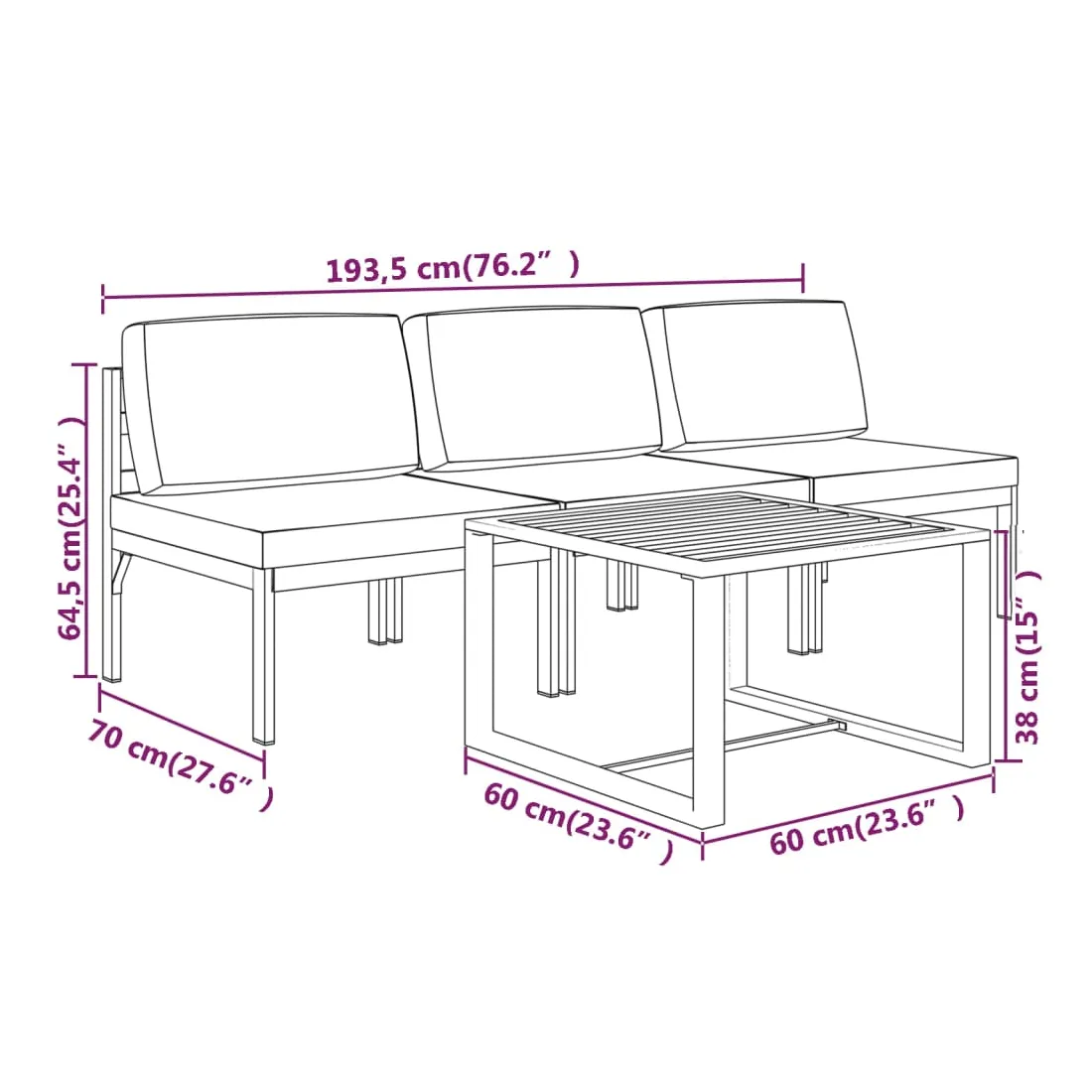 • Dimensions du canapé central : 64,5 x 70 x 64,5 cm (l x P x H)