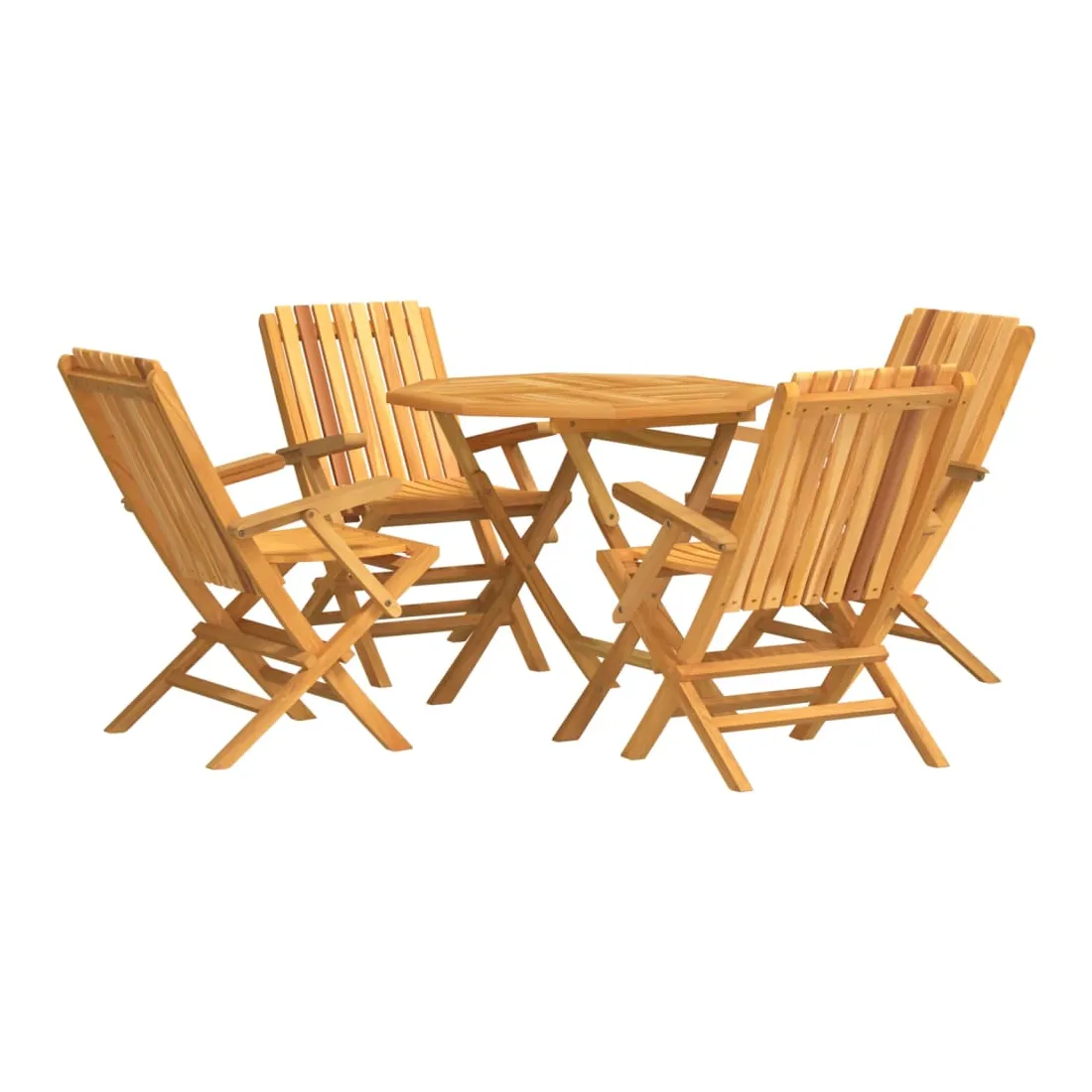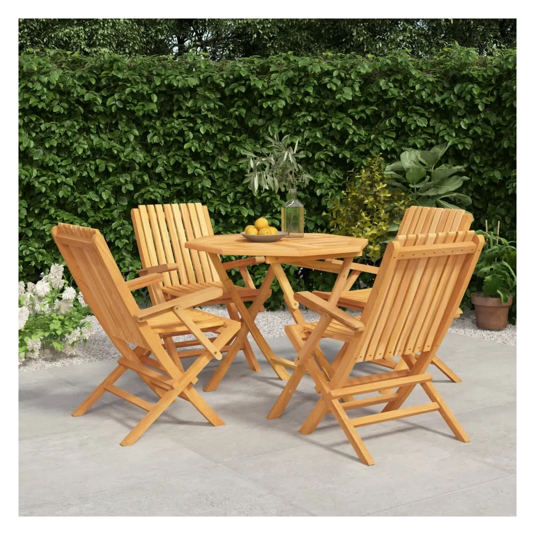 Détendez-vous et profitez d'un thé et de repas agréables avec votre famille et vos amis grâce à cet ensemble de salle à manger de jardin en bois classique ! Bois de teck massif : l'ensemble de salle à manger est fabriqué en bois de teck massif. Le bois de teck massif est un matériau naturel magnifique. Il a été chevronné, séché au four, puis sablé finement pour lui donner une apparence très lisse. Le bois de teck est connu pour sa résistance exceptionnelle et sa résistance aux intempéries.Fonction pliable : l'ensemble de salle à manger d'extérieur peut être plié pour économiser de l'espace lorsqu'il n'est pas utilisé.Expérience confortable : le dossier de la chaise de jardin vous offre un excellent soutien, offrant une expérience confortable optimale.Dessus de table robuste : le dessus de table robuste de la table à manger est parfait pour placer des repas, des boissons, des vases, des bols de fruits ou d'autres objets décoratifs.Trou pour parasol : le dessus de table est doté d'un trou pour parasol, ce qui vous permet de fixer facilement un parasol pour créer un coin ombragé.Design à lattes : la chaise à manger d'extérieur conçue avec un design à lattes est simple et intemporelle. Remarque :Pour que vos meubles d'extérieur restent beaux, nous vous recommandons de les protéger avec une housse imperméable.