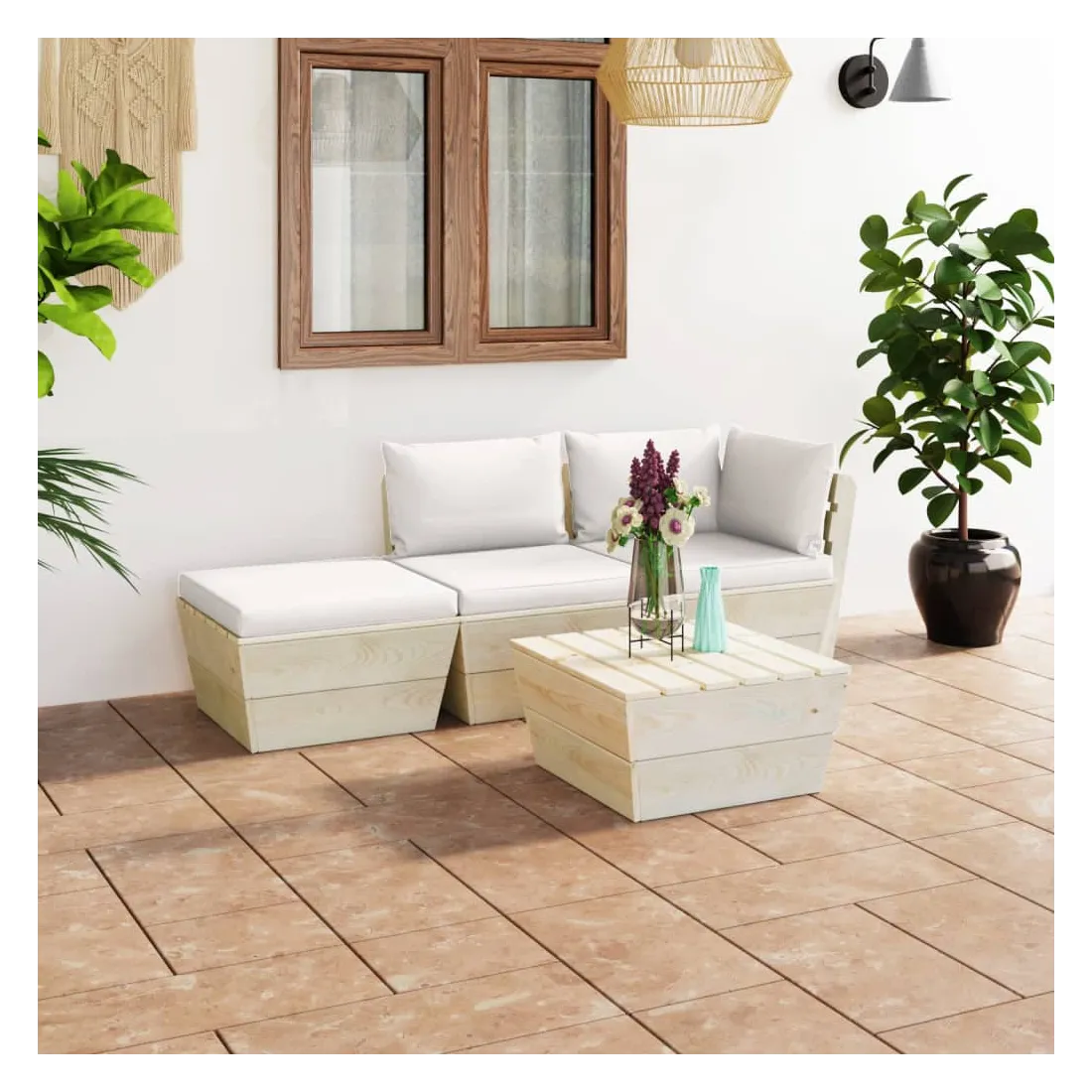 vidaXLCet ensemble de salon de jardin palette de 4 pièces à la mode avec coussins est un excellent choix pour vous détendre et profiter du beau temps, faire une sieste ou discuter avec votre famille ou vos amis. L’ensemble de salon en bois, avec un design de palette intemporel, ajoute une touche de charme rustique à votre patio, jardin ou salon. L’ensemble de salon de jardin est en bois d'épicéa imprégné, ce qui le rend durable et stable. Cet ensemble de canapés de patio présente une construction solide et nécessite peu d’entretien. Avec un dessus de table solide, la table est idéale pour garder la nourriture et les boissons à portée de main. Grâce à la tapisserie 100 % polyester et au rembourrage épais, les coussins de palette sont doux et offrent le plus grand confort. De plus, la conception modulaire permet également de placer l’ensemble dans n’importe quel arrangement selon votre goût. Veuillez noter que le bois est un produit naturel et peut présenter des imperfections.