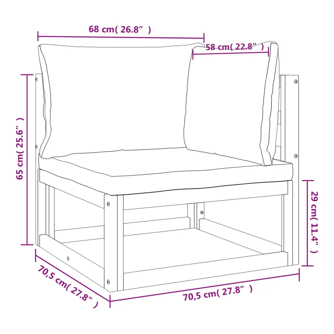 - Hauteur de l'assise depuis le sol (sans coussin) : 29 cm