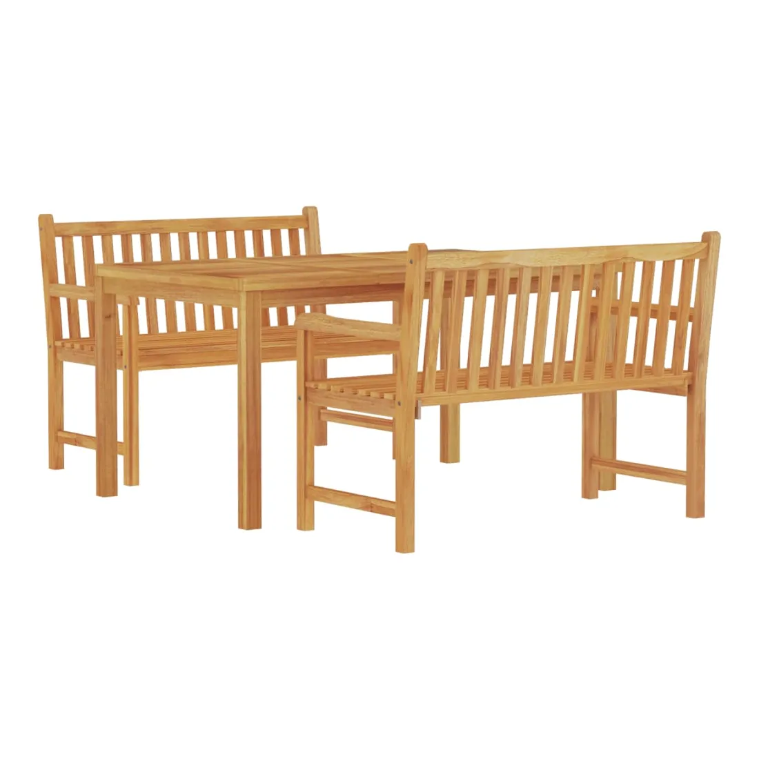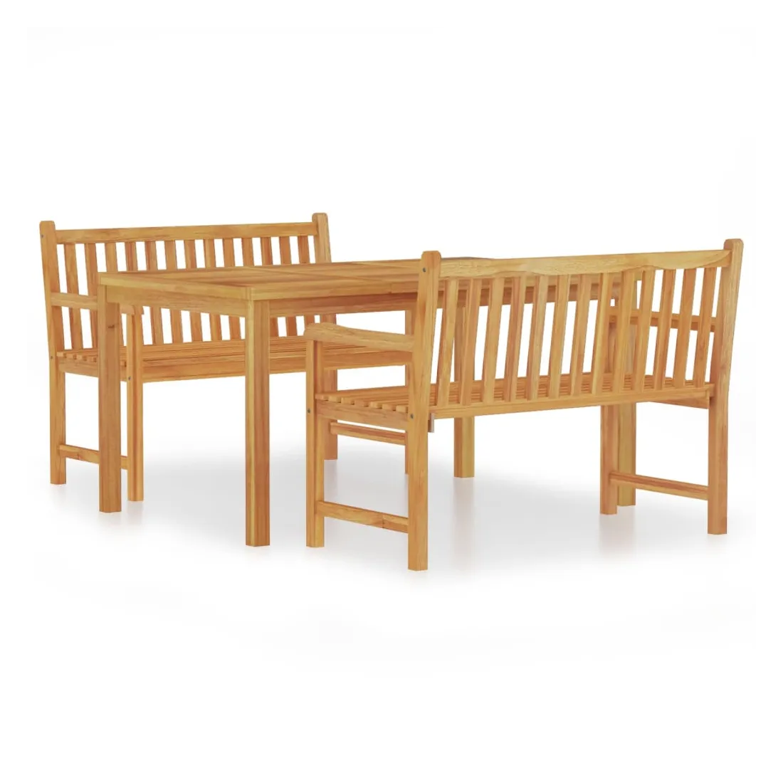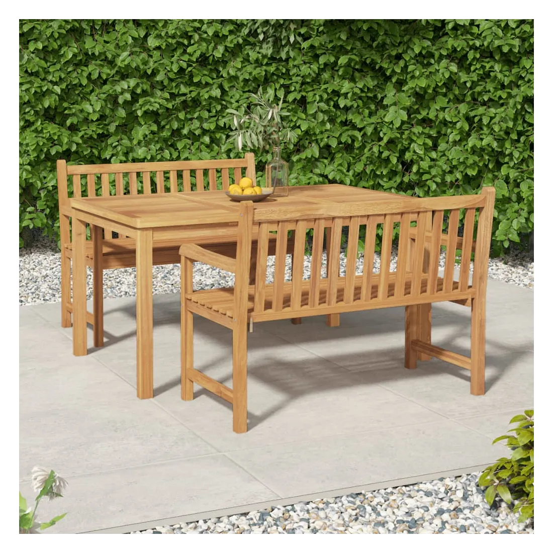 Cet ensemble de salle à manger de jardin en bois, au design élégant et contemporain, est un excellent choix pour manger ou vous détendre dans le jardin. Bois de teck massif : le bois de teck massif est un matériau naturel magnifique. Il a été chevronné, séché au four, puis sablé finement pour lui donner une apparence très lisse. Le bois de teck est connu pour sa résistance exceptionnelle et sa résistance aux intempéries.Dessus de table robuste : cette table de repas vous offre un dessus de table robuste. Vous pouvez y placer vos collations, tes boissons et toutes vos décorations préférées.Caractéristique résistante à l'eau : grâce à sa caractéristique de résistance à l'eau et à son look classique, vous pouvez placer l'ensemble de meubles de jardin n'importe où autour de votre maison, que ce soit à l'intérieur ou à l'extérieur !Expérience d'assise confortable : chaque banc est doté d'un dossier, ce qui rend l'assise très confortable. Remarque :Chaque produit est livré avec un manuel de montage dans la boîte pour un montage facile.Afin de prolonger la durée de vie de votre mobilier d'extérieur, nous vous recommandons de le protéger avec une housse imperméable.