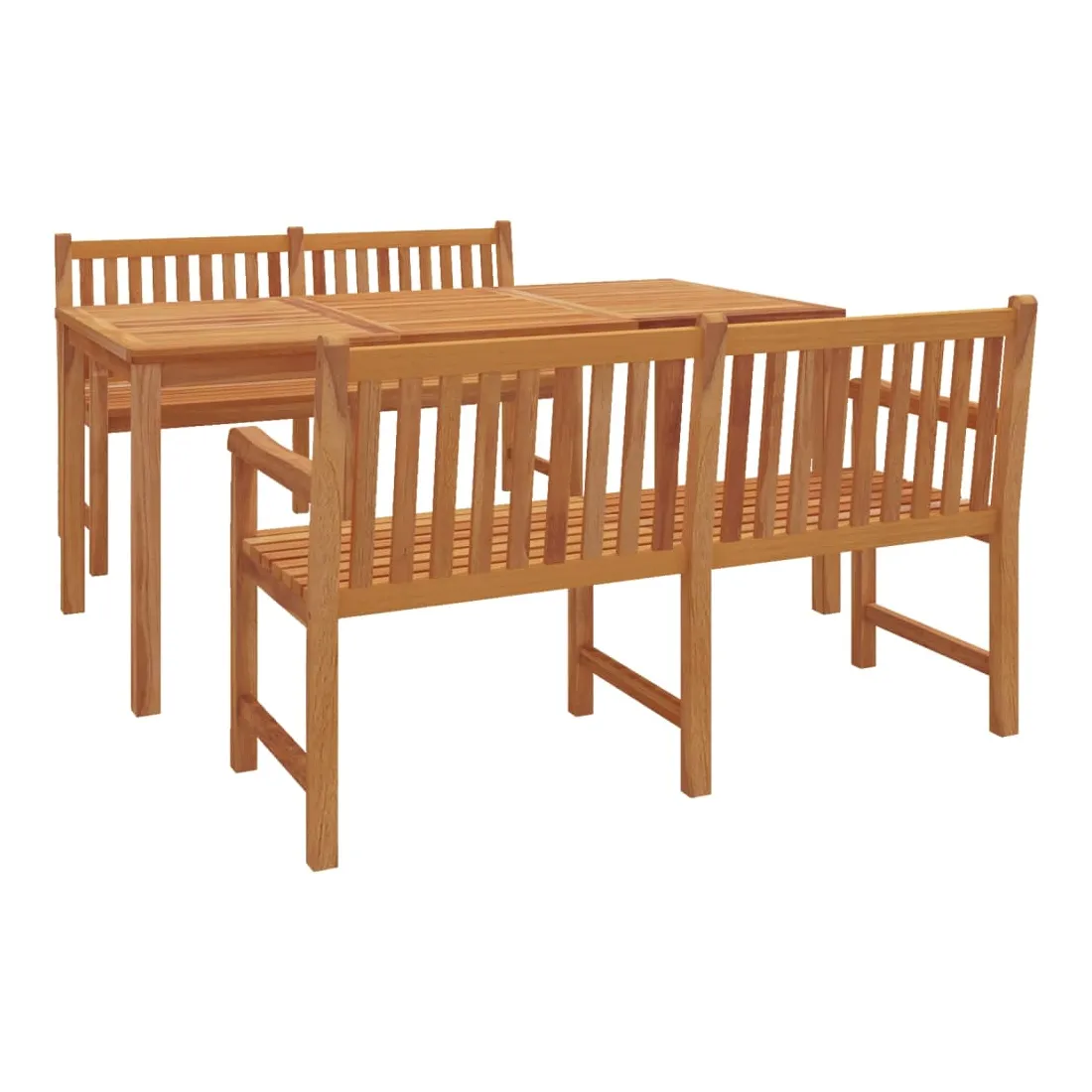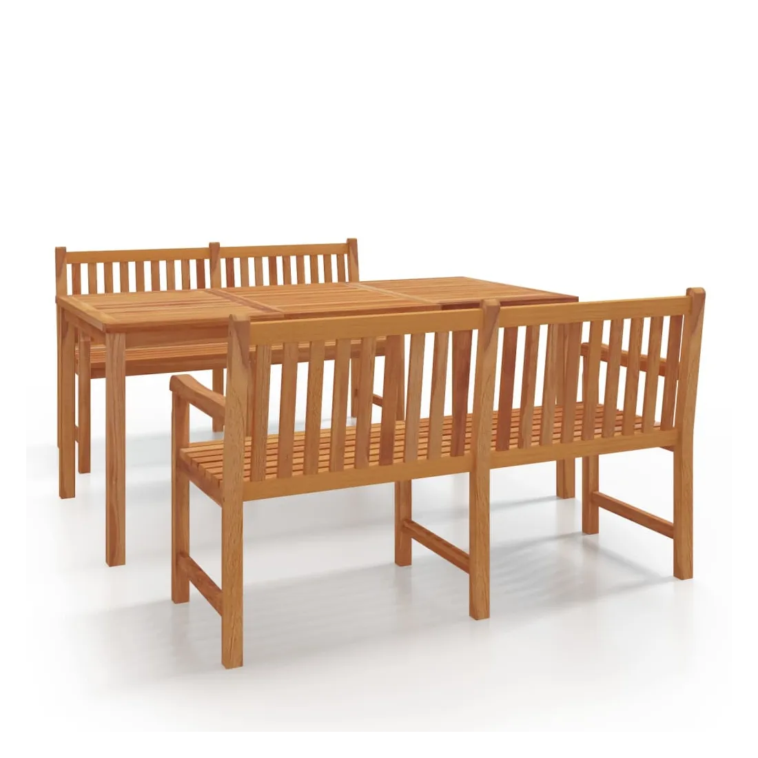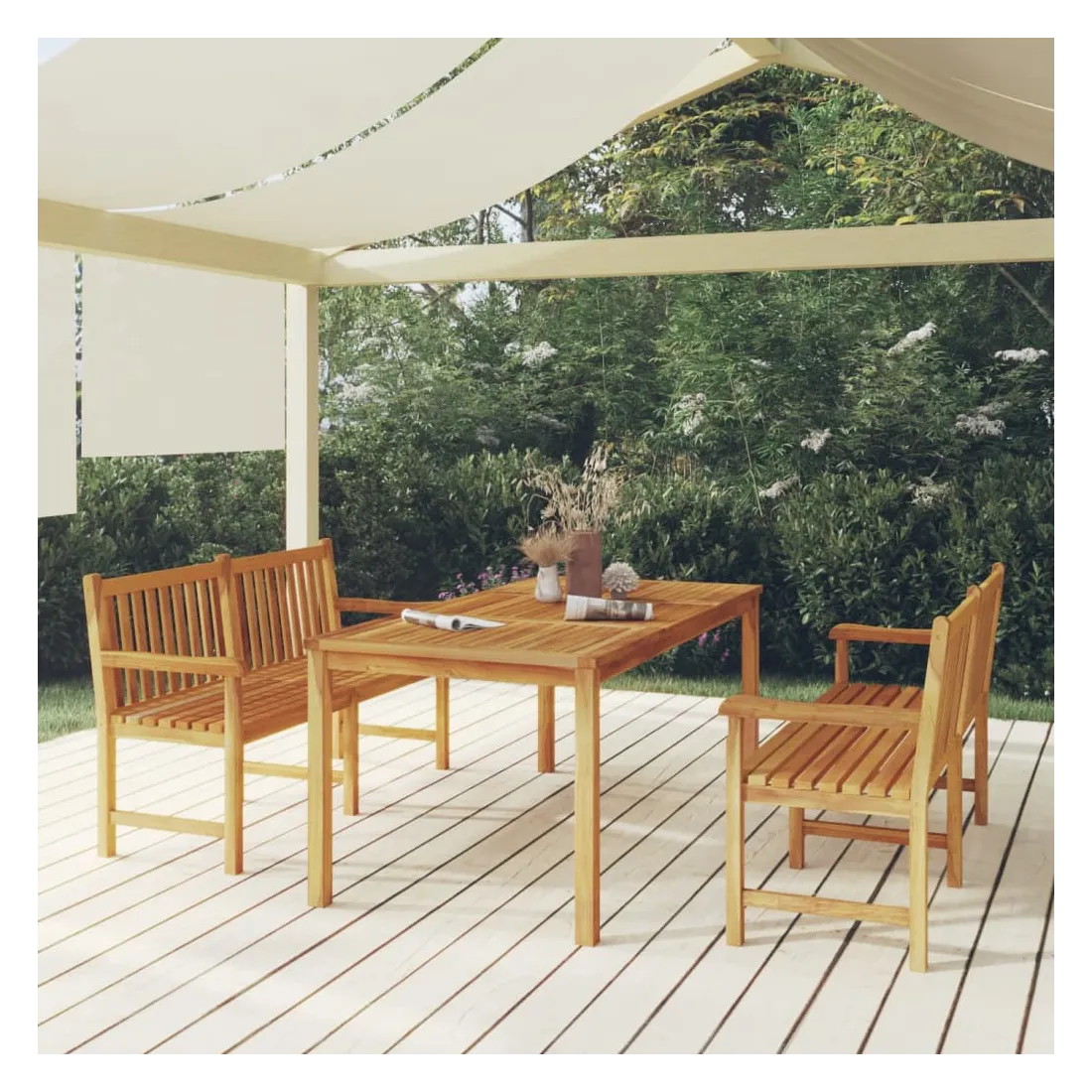vidaXLCet ensemble de salle à manger de jardin en bois, au design élégant et contemporain, est un excellent choix pour manger ou vous détendre dans le jardin. Bois de teck massif : le bois de teck massif est un matériau naturel magnifique. Il a été chevronné, séché au four, puis sablé finement pour lui donner une apparence très lisse. Le bois de teck est connu pour sa résistance exceptionnelle et sa résistance aux intempéries.Dessus de table robuste : cette table de repas vous offre un dessus de table robuste. Vous pouvez y placer vos collations, tes boissons et toutes vos décorations préférées.Caractéristique résistante à l'eau : grâce à sa caractéristique de résistance à l'eau et à son look classique, vous pouvez placer l'ensemble de meubles de jardin n'importe où autour de votre maison, que ce soit à l'intérieur ou à l'extérieur !Expérience d'assise confortable : chaque banc est doté d'un dossier, ce qui rend l'assise très confortable. Remarque :Chaque produit est livré avec un manuel de montage dans la boîte pour un montage facile.Afin de prolonger la durée de vie de votre mobilier d'extérieur, nous vous recommandons de le protéger avec une housse imperméable.