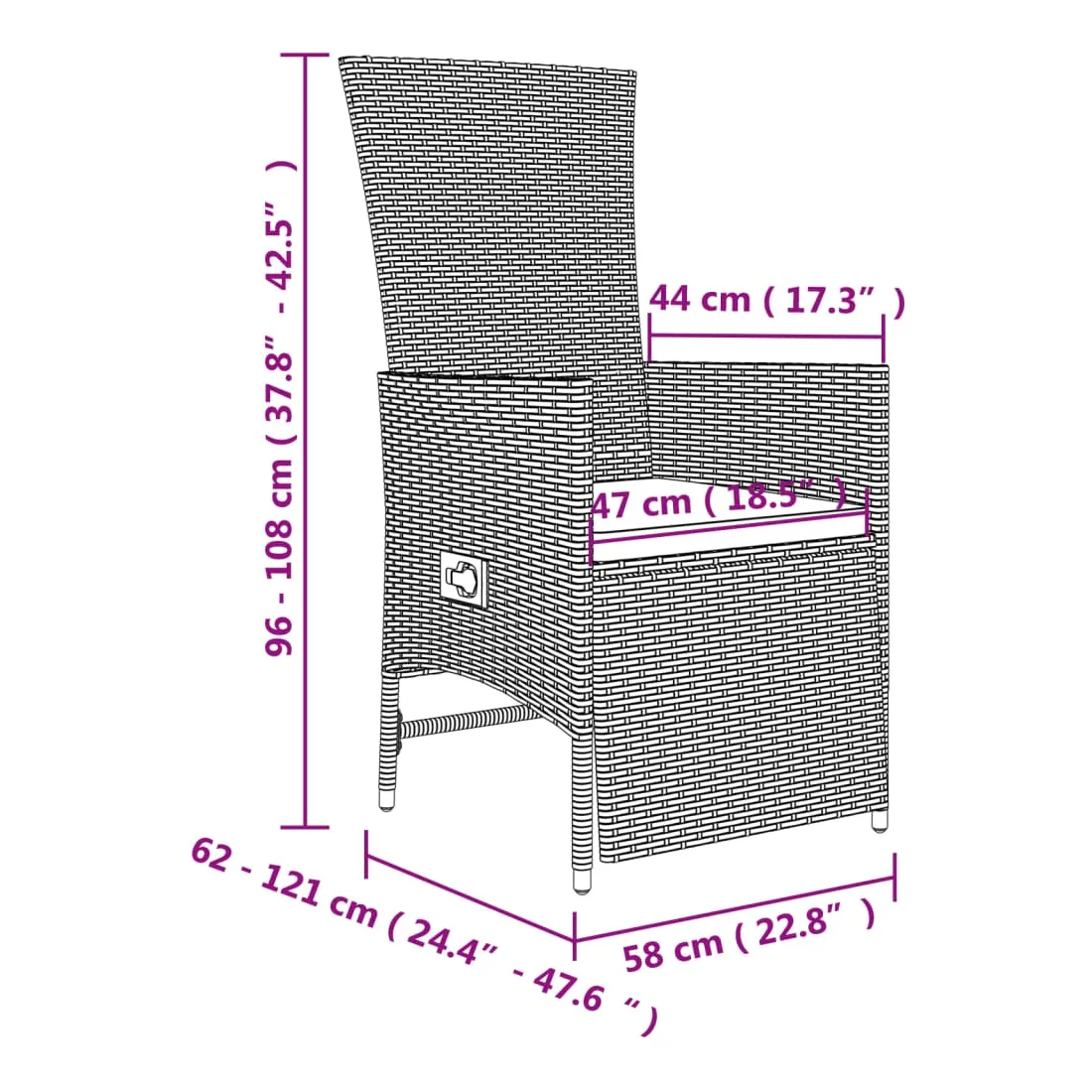 vidaXLCet ensemble de salle à manger de jardin tendance, au design élégant et contemporain, est un excellent choix pour manger ou vous détendre dans votre jardin. Matériau résistant aux intempéries : la résine tressée, également connue sous le nom de rotin poly, résiste aux intempéries et est facile à nettoyer. Elle reste belle à l'extérieur pendant une longue période. Elle offre une excellente qualité, commodité et un aspect esthétique.Cadre robuste : les cadres en acier enduit de poudre rendent l'ensemble de salle à manger d'extérieur robuste et stable pour une utilisation quotidienne à l'extérieur.Dessus de table pratique : le dessus de table robuste est parfait pour placer des repas, des boissons et d'autres objets décoratifs.Conception modulaire : l'ensemble de salle à manger de jardin est flexible et facile à déplacer, vous pouvez donc le combiner avec d'autres segments modulaires dans la boutique en ligne pour créer vos propres configurations d'ensemble de salle à manger de jardin !Fonction d'inclinaison : les chaises de jardin sont spécialement conçues avec une fonction d'inclinaison afin que vous puissiez régler le dossier selon votre confort. Bon à savoir :Pour faciliter au maximum le montage, chaque produit est livré avec des instructions. Remarque :Pour que vos meubles d'extérieur restent beaux, nous vous recommandons de les protéger avec une housse imperméable.