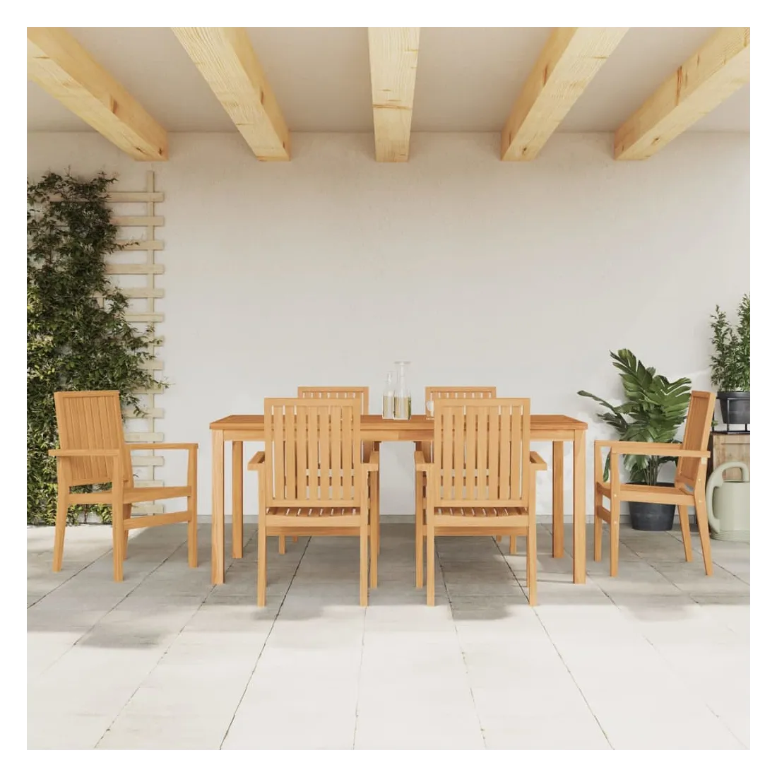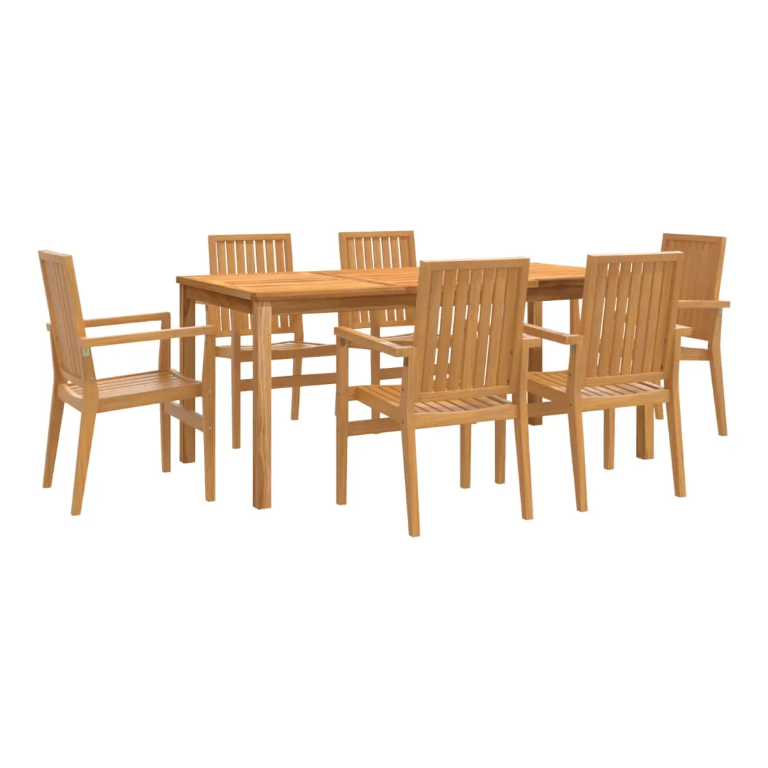 vidaXLProfitez d'un bon repas ou d'un thé l'après-midi dans votre espace extérieur avec cet ensemble à manger de jardin en bois ! Bois de teck massif : le bois de teck massif est un matériau naturel magnifique. Il a été chevronné, séché au four, puis sablé finement pour lui donner une apparence très lisse. Le bois de teck est connu pour sa résistance exceptionnelle et sa résistance aux intempéries.Dessus de table pratique : le dessus de table robuste de la table à manger permet de placer des collations, des paniers de fruits, des objets décoratifs et d'autres objets nécessaires.Assise confortable : le dossier et les accoudoirs assurent une assise confortable à votre fauteuil de jardin.Fonction empilable : la chaise à manger est empilable pour économiser de l'espace lorsqu'elle n'est pas utilisée.Surface facile à nettoyer : la surface lisse rend l'ensemble de meubles de jardin facile à nettoyer avec un chiffon humide. Bon à savoir :Pour que vos meubles d'extérieur restent beaux, nous vous recommandons de les protéger avec une housse imperméable.