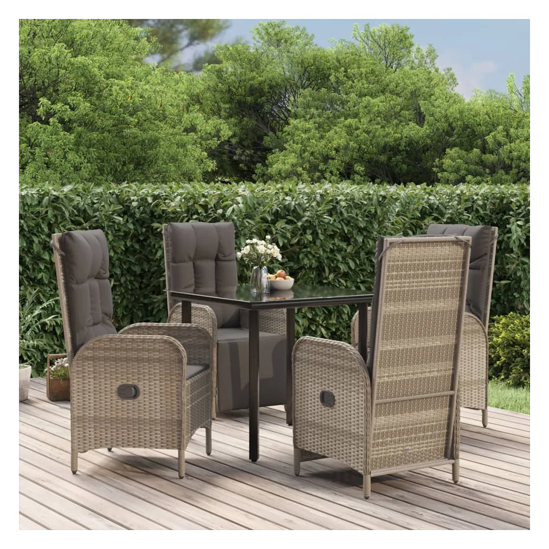 Cet ensemble de salle à manger de jardin tendance, au design élégant et contemporain, est un excellent choix pour manger ou vous détendre dans votre jardin. Matériau résistant aux intempéries : la résine tressée, également connue sous le nom de rotin poly, résiste aux intempéries et est facile à nettoyer. Elle reste belle à l'extérieur pendant une longue période. Elle offre une excellente qualité, commodité et un aspect esthétique.Cadre robuste : les cadres en acier enduit de poudre rendent l'ensemble de salle à manger d'extérieur robuste et stable pour une utilisation quotidienne à l'extérieur.Dessus de table pratique : le dessus lisse de la table de jardin est en verre trempé, facile à nettoyer avec un chiffon humide. De plus, le dessus robuste est parfait pour placer des repas, des boissons et d'autres objets décoratifs.Fonction d'inclinaison : les chaises de jardin sont spécialement conçues avec une fonction d'inclinaison afin que vous puissiez régler le dossier selon votre confort.Expérience d'assise confortable : le dossier ajoute un confort d'assise supplémentaire à la chaise de jardin. De plus, les coussins bien rembourrés vous permettent de vous asseoir confortablement. Bon à savoir :Pour faciliter au maximum le montage, chaque produit est livré avec des instructions. Remarque :Pour que vos meubles d'extérieur restent beaux, nous vous recommandons de les protéger avec une housse imperméable.