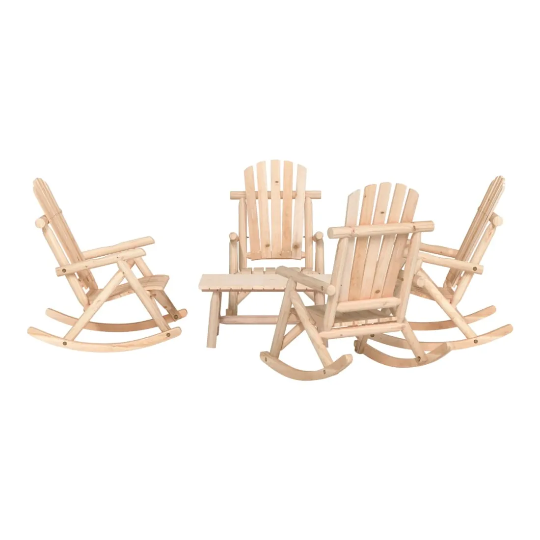 Profitez d'un moment de loisirs confortable avec votre famille dans votre espace extérieur sur cet ensemble de salon de jardin en bois ! Bois d'épicéa massif : fabriquée en bois d'épicéa massif, l'ensemble de salon est durable et stable.Design à bascule : détendez-vous en vous asseyant confortablement sur les chaises à bascule de jardin tout en profitant d'un mouvement de basculement doux et apaisant.Expérience de siège confortable : avec des sièges incurvés, des accoudoirs et des dossiers de style Adirondack, les chaises longues vous permettent de vous asseoir confortablement après une longue journée.Dessus de table robuste : le dessus de table robuste de la table basse est idéal pour poser la vaisselle, les boissons et les collations. Bon à savoir :Pour que vos meubles d'extérieur restent beaux, nous vous recommandons de les protéger avec une housse imperméable.Il est recommandé de traiter le bois avec une peinture d'extérieur, afin de prolonger la durée de vie du produit.