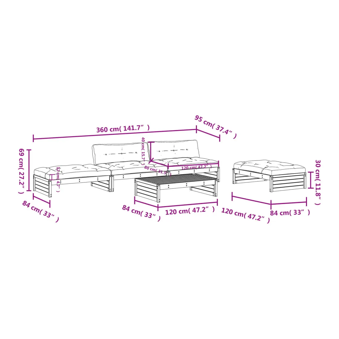 - Dimensions du repose-pied/de la table basse de jardin : 120 x 84 x 30 cm (L x l x H)