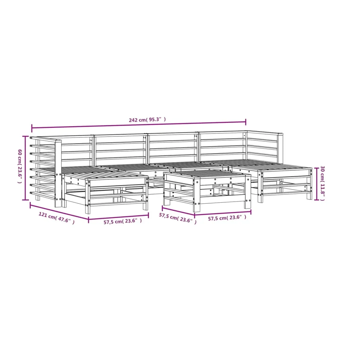 - Dimensions du canapé central : 57,5 x 63,5 x 60 cm (L x l x H)