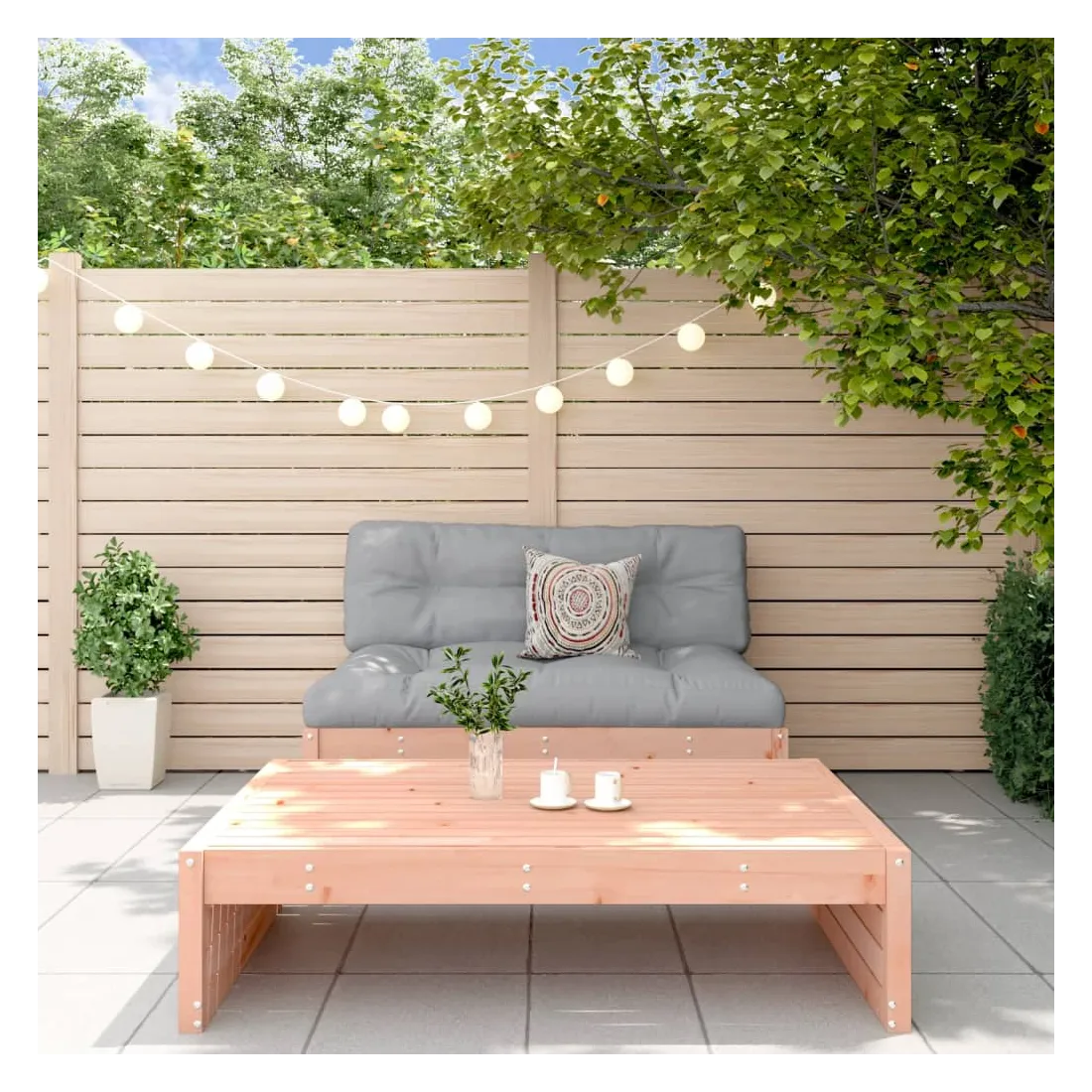 Ce salon de jardin en bois, qui se démarque par son design à lattes, sera un excellent supplément à votre jardin, patio ou terrasse pour profiter d'un moment agréable avec votre famille ou vos amis. Bois de douglas massif : le bois de douglas massif est un bois très durable qui fonctionne bien pour l'extérieur. Le bois de douglas est également suffisamment solide pour être travaillé avec un minimum de soin, même sous l'influence des intempéries.Cadre robuste et stable : le cadre en bois rend l'ensemble de salon robuste et stable pour une utilisation quotidienne à l'extérieur.Expérience d'assise confortable : le dossier ajoute un confort d'assise supplémentaire au canapé d'extérieur.Design modulaire : le canapé est flexible et facile à déplacer. Vous pouvez le combiner avec d'autres segments modulaires de la boutique en ligne pour créer vos propres configurations de salon de jardin ! Bon à savoir :Les coussins ne sont pas inclus dans la livraison.Pour que vos meubles d'extérieur restent beaux, nous vous recommandons de les protéger avec une housse imperméable.