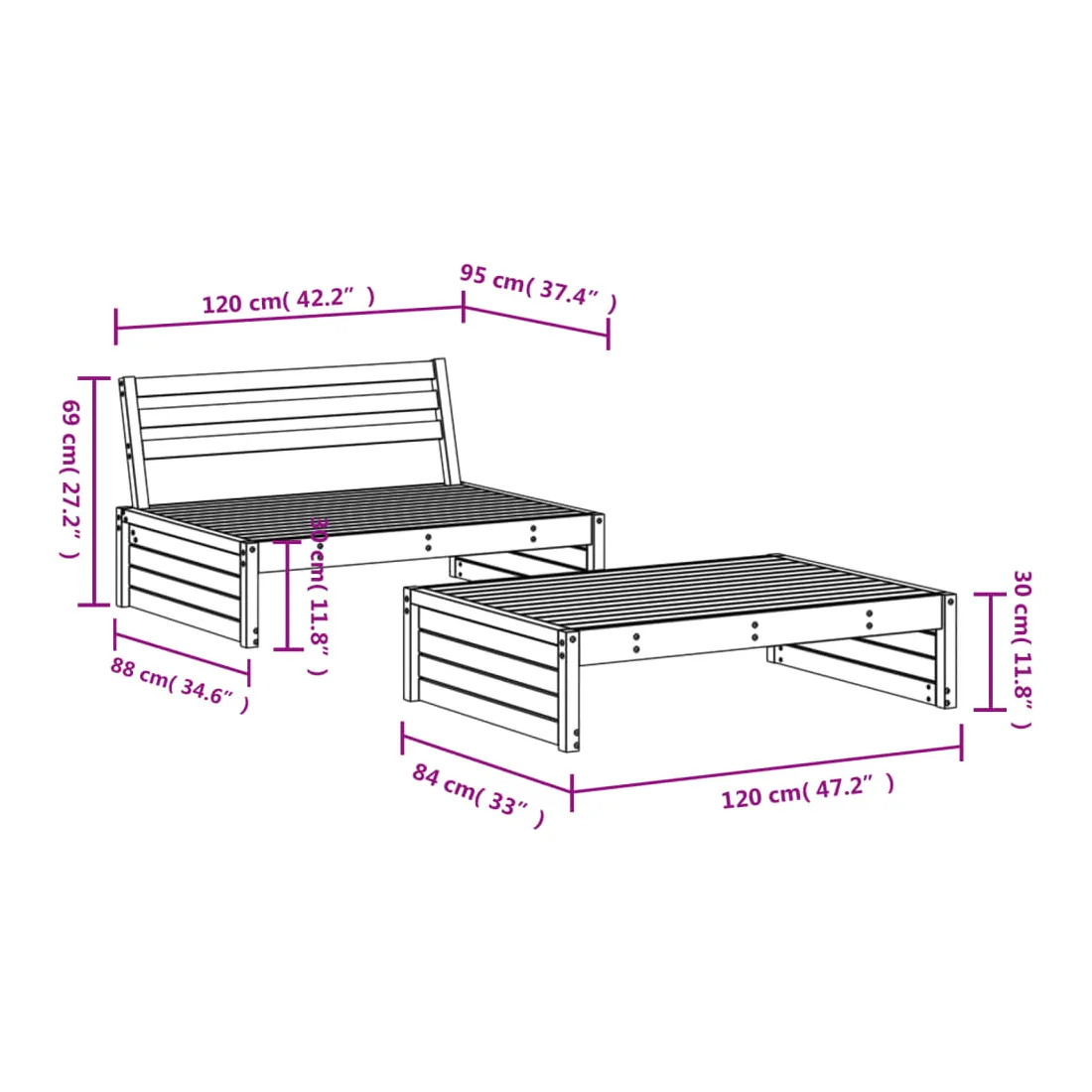 - Dimensions du repose-pied/de la table basse de jardin : 120 x 84 x 30 cm (L x l x H)