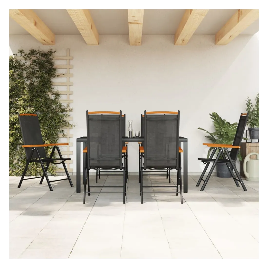 Cet ensemble de salle à manger de jardin à la fois pratique et élégant est parfait pour vous détendre ou dîner dans votre jardin ou sur votre terrasse. Matériau respirant : les sièges sont confortables grâce au textilène respirant. Le tissu textilène permet à l'air de circuler librement à travers lui tout en étant résistant aux rayons UV. Le textilène est donc idéal par temps chauds. En tant que matériau durable et solide, il est très résistant aux déchirures, aux perforations et à la moisissure.Cadre robuste : le cadre en aluminium revêtu de poudre rend l'ensemble de salle à manger robuste et durable pour une utilisation à l'extérieur.Dossier réglable : les dossiers des chaises de jardin sont réglables en 7 positions afin que vous puissiez toujours trouver la position la plus confortable.Fonction pliable : la chaise inclinable peut être pliée pour gagner de la place lorsqu'elle n'est pas utilisée.Table pratique : la table à manger est dotée d'un dessus de table en WPC, facile à nettoyer et adapté à une utilisation en plein air. Le dessus de table robuste est parfait pour placer des repas, des boissons, des vases, des coupes de fruits ou d'autres objets décoratifs. Bon à savoir :Pour que vos meubles d'extérieur restent beaux, nous vous recommandons de les protéger avec une housse imperméable.