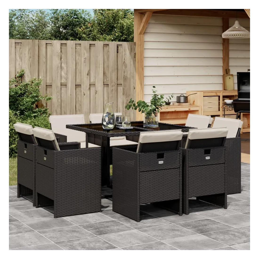 Cet ensemble de salle à manger de jardin est un excellent choix pour les repas en plein air ou pour vous détendre dans le jardin, dans l'arrière-cour ou sur la terrasse. Matériau durable : la résine tressée, également connue sous le nom de poly rotin, est un matériau synthétique solide et nécessitant peu d'entretien qui ressemble au rotin naturel. Il est léger, facile à nettoyer et couramment utilisé pour les meubles d'extérieur en raison de sa durabilité et de ses propriétés de résistance aux intempéries.Rangement compact : ces chaises sont dotées d'un dossier rabattable, ce qui permet de les ranger facilement sous la table. Une fois pliées, elles se rangent parfaitement sous la table, formant un cube peu encombrant. Expérience d'assise confortable : ce mobilier d'extérieur, doté de coussins épais, offre une expérience d'assise confortable.Housse amovible et lavable : ces coussins de siège sont dotés de housses amovibles pour un lavage et un entretien faciles.Dessus en verre : le dessus de la table d'extérieur est fabriqué en verre trempé solide et durable, ce qui le rend facile à nettoyer avec un chiffon humide et ajoute une touche d'élégance à votre espace extérieur. Bon à savoir : Pour que vos meubles d'extérieur restent beaux, nous vous recommandons de les protéger avec une housse imperméable.