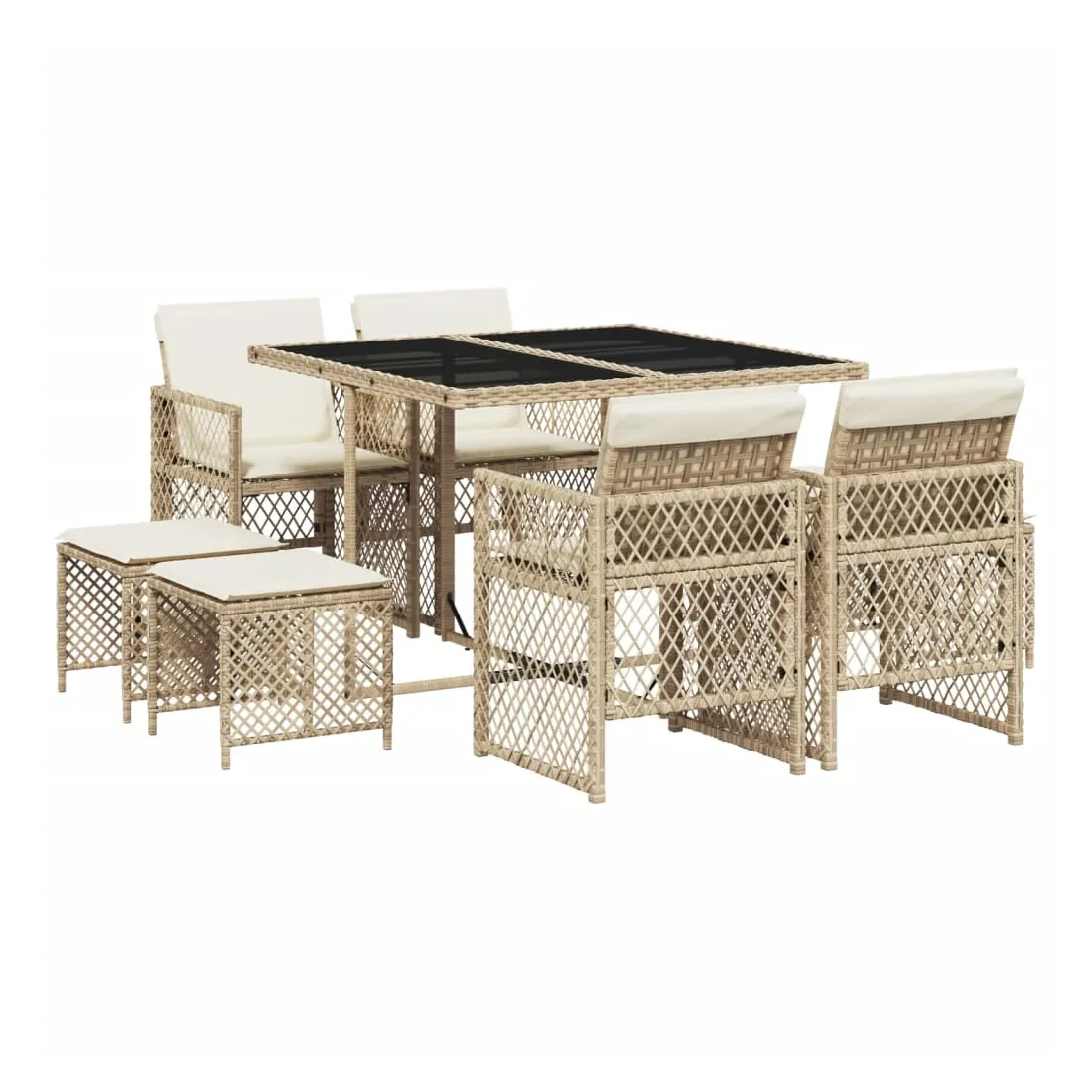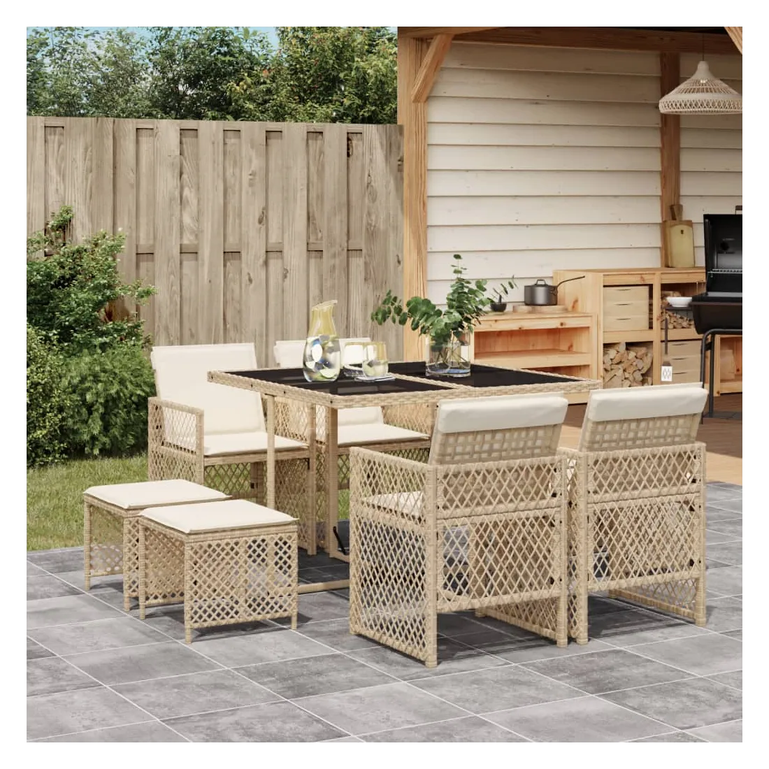 Cet ensemble de salle à manger de jardin est un excellent choix pour les repas en plein air ou pour vous détendre dans le jardin, l'arrière-cour ou le patio. Matériau durable : la résine tressée, également connue sous le nom de poly rotin, est un matériau synthétique solide et nécessitant peu d'entretien qui ressemble au rotin naturel. Elle est légère, facile à nettoyer et couramment utilisée pour les meubles d'extérieur en raison de sa durabilité et de ses propriétés de résistance aux intempéries. Dessus en verre : le dessus de la table d'extérieur est fabriqué en verre trempé solide et durable, ce qui le rend facile à nettoyer avec un chiffon humide et ajoute une touche d'élégance à votre espace extérieur. Rangement compact : ces chaises sont dotées d'un dossier rabattable, ce qui permet de les ranger facilement sous la table. Une fois pliées, elles se rangent parfaitement sous la table, formant un cube peu encombrant. De plus, les tabourets peuvent également être rangés sous les chaises, maximisant encore davantage l'efficacité de l'espace. Expérience d'assise confortable : ce mobilier d'extérieur, doté de coussins épais, offre une expérience d'assise confortable. Housse amovible et lavable : ces coussins de siège sont dotés de housses amovibles pour un lavage et un entretien faciles. Les housses de coussin de chaise ont un rabat à l'arrière pour une fixation facile aux chaises. Bon à savoir :Pour que vos meubles d'extérieur restent beaux, nous vous recommandons de les protéger avec une housse imperméable.