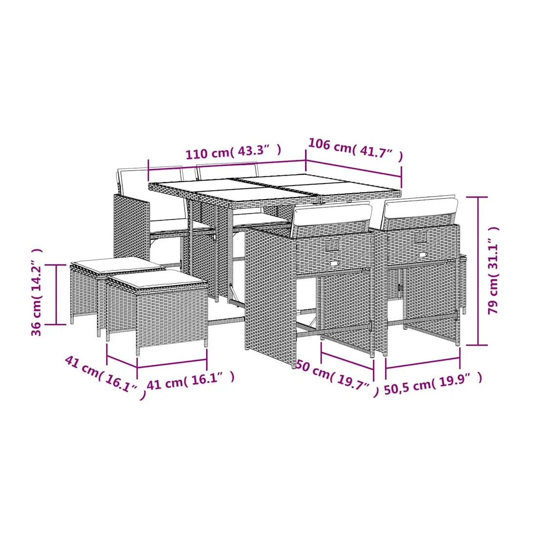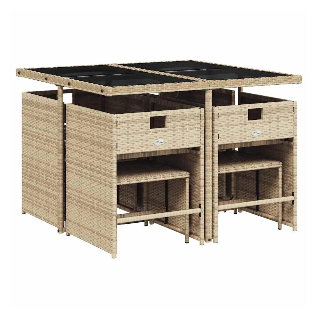 Cet ensemble de salle à manger de jardin est un excellent choix pour les repas en plein air ou pour vous détendre dans le jardin, dans l'arrière-cour ou sur la terrasse. Matériau durable : la résine tressée, également connue sous le nom de poly rotin, est un matériau synthétique solide et nécessitant peu d'entretien qui ressemble au rotin naturel. Il est léger, facile à nettoyer et couramment utilisé pour les meubles d'extérieur en raison de sa durabilité et de ses propriétés de résistance aux intempéries.Rangement compact : ces chaises sont dotées d'un dossier rabattable, ce qui permet de les ranger facilement sous la table. Une fois pliées, elles se rangent parfaitement sous la table, formant un cube peu encombrant. De plus, les tabourets peuvent également être rangés sous les chaises, maximisant encore davantage l'efficacité de l'espace.Expérience d'assise confortable : ce mobilier d'extérieur, doté de coussins bien rembourrés, offre une expérience d'assise confortable.Housse amovible et lavable : ces coussins de siège sont dotés de housses amovibles pour un lavage et un entretien faciles. Les housses de coussin de chaise ont un rabat à l'arrière pour une fixation facile aux chaises.Dessus stable et facile à nettoyer : cette table de jardin est dotée d'un dessus en verre trempé robuste, durable et facile à nettoyer à l'aide d'un chiffon humide. Bon à savoir : Pour que vos meubles d'extérieur restent beaux, nous vous recommandons de les protéger avec une housse imperméable.