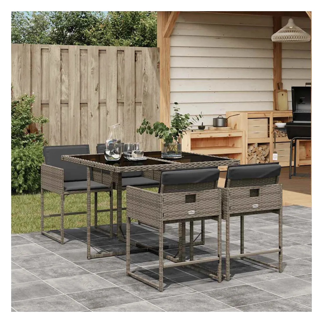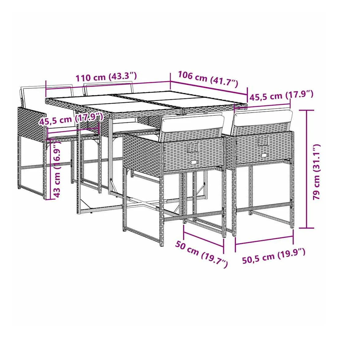 Cet ensemble de salle à manger de jardin est un excellent choix pour les repas en plein air ou pour vous détendre dans le jardin, dans l'arrière-cour ou sur la terrasse. Matériau durable : la résine tressée, également connue sous le nom de poly rotin, est un matériau synthétique solide et nécessitant peu d'entretien qui ressemble au rotin naturel. Il est léger, facile à nettoyer et couramment utilisé pour les meubles d'extérieur en raison de sa durabilité et de ses propriétés de résistance aux intempéries.Rangement compact : ces chaises sont dotées d'un dossier rabattable, ce qui permet de les ranger facilement sous la table. Une fois pliées, elles se rangent parfaitement sous la table, formant un cube peu encombrant.Expérience d'assise confortable : ce mobilier d'extérieur, doté de coussins épais, offre une expérience d'assise confortable.Housse amovible et lavable : ces coussins de siège sont dotés de housses amovibles pour un lavage et un entretien faciles. Les housses de coussin ont un rabat à l'arrière pour une fixation facile aux dossiers.Dessus en verre : le dessus de la table d'extérieur est fabriqué en verre trempé solide et durable, ce qui le rend facile à nettoyer avec un chiffon humide et ajoute une touche d'élégance à votre espace extérieur. Bon à savoir :Pour que vos meubles d'extérieur restent beaux, nous vous recommandons de les protéger avec une housse imperméable.