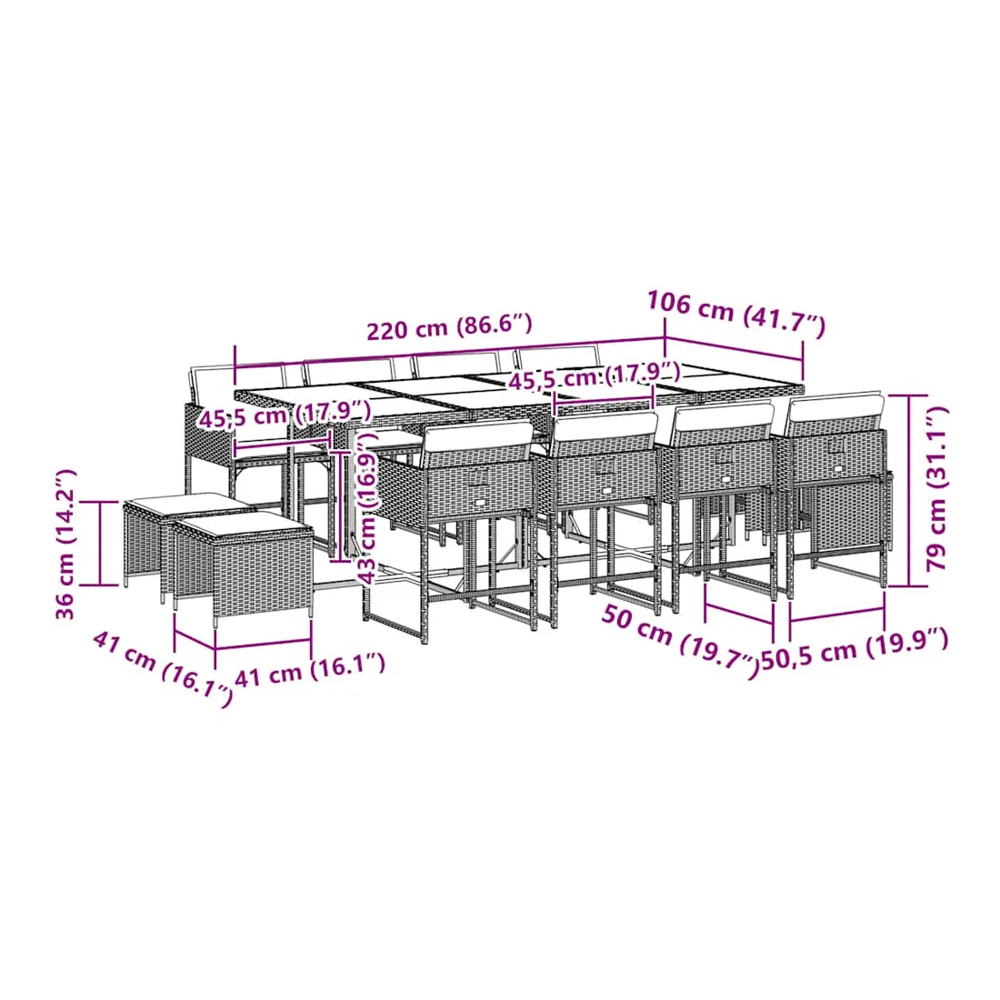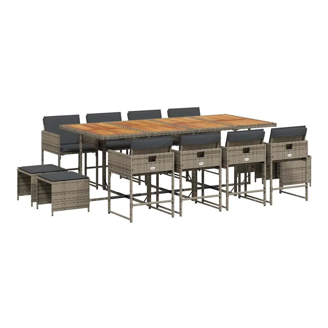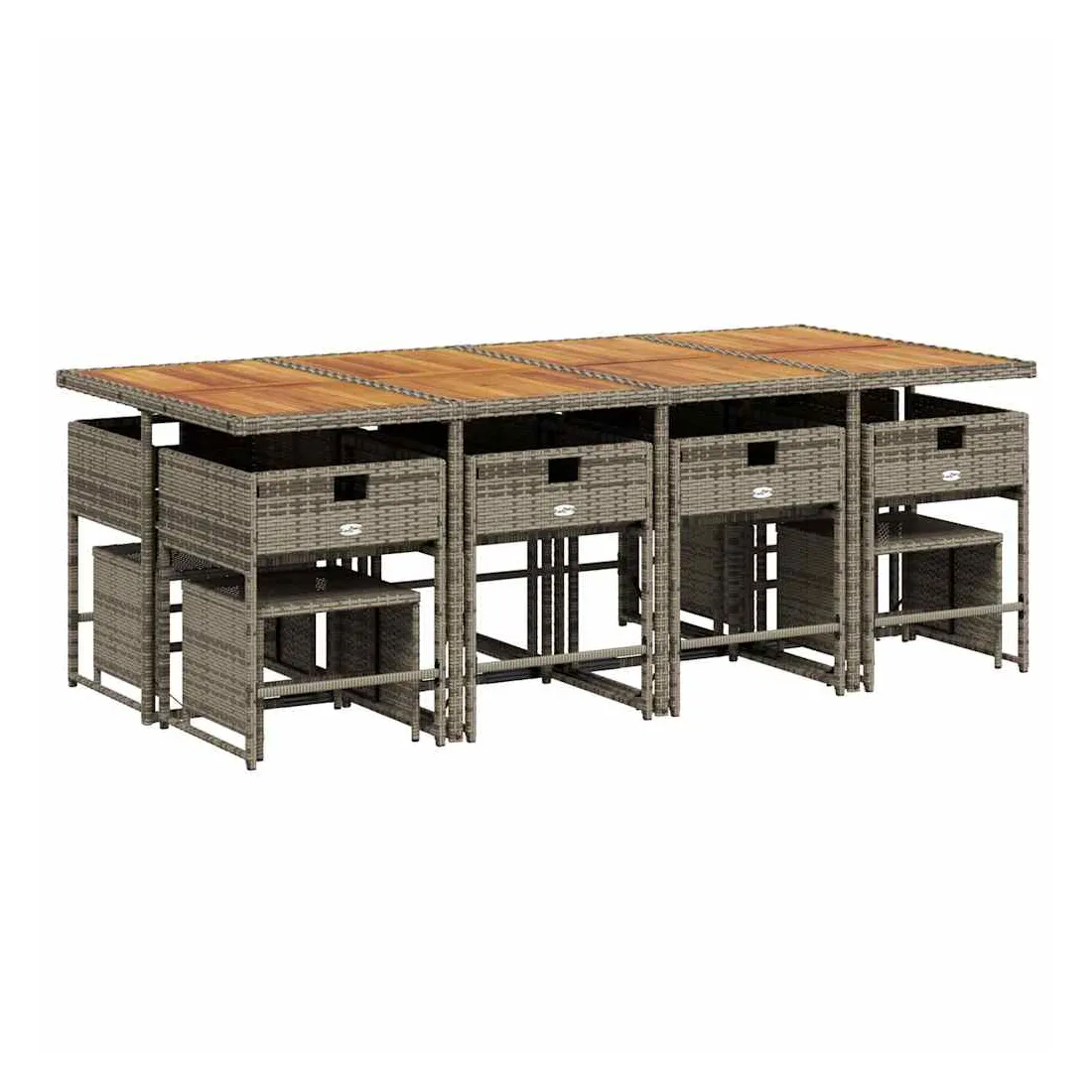 vidaXLCet ensemble de salle à manger de jardin est un excellent choix pour les repas en plein air ou pour vous détendre dans le jardin, dans l'arrière-cour ou sur la terrasse. Matériau durable : la résine tressée, également connue sous le nom de poly rotin, est un matériau synthétique solide et nécessitant peu d'entretien qui ressemble au rotin naturel. Il est léger, facile à nettoyer et couramment utilisé pour les meubles d'extérieur en raison de sa durabilité et de ses propriétés de résistance aux intempéries.Rangement compact : ces chaises sont dotées d'un dossier rabattable, ce qui permet de les ranger facilement sous la table. Une fois pliées, elles se rangent parfaitement sous la table, formant un cube peu encombrant. De plus, les tabourets peuvent également être rangés sous les chaises, maximisant encore davantage l'efficacité de l'espace.Expérience d'assise confortable : ce mobilier d'extérieur, doté de coussins épais, offre une expérience d'assise confortable.Housse amovible et lavable : ces coussins de siège sont dotés de housses amovibles pour un lavage et un entretien faciles. Les housses de coussin ont un rabat à l'arrière pour une fixation facile aux dossiers.Dessus stable et facile à nettoyer : cette table de jardin a un dessus en bois d'acacia robuste, durable et facile à nettoyer avec un chiffon humide. Bon à savoir : Pour que vos meubles d'extérieur restent beaux, nous vous recommandons de les protéger avec une housse imperméable.
