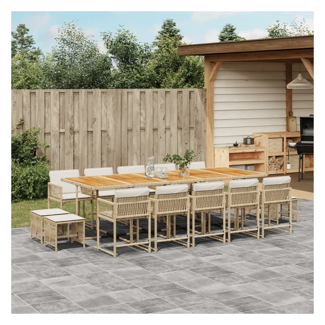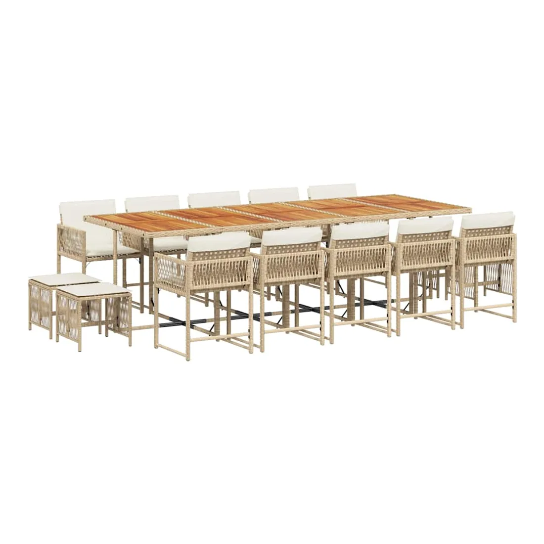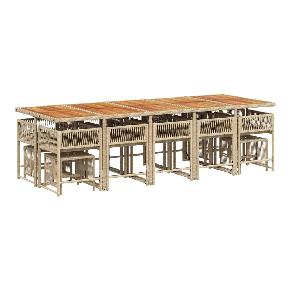 Cet ensemble de salle à manger de jardin est un excellent choix pour les repas en plein air ou pour vous détendre dans le jardin, dans l'arrière-cour ou sur la terrasse. Matériau durable : la résine tressée, également connue sous le nom de poly rotin, est un matériau synthétique solide et nécessitant peu d'entretien qui ressemble au rotin naturel. Il est léger, facile à nettoyer et couramment utilisé pour les meubles d'extérieur en raison de sa durabilité et de ses propriétés de résistance aux intempéries.Rangement compact : ces chaises sont dotées d'un dossier rabattable, ce qui permet de les ranger facilement sous la table. Une fois pliées, elles se rangent parfaitement sous la table, formant un cube peu encombrant. De plus, les tabourets peuvent également être rangés sous les chaises, maximisant encore davantage l'efficacité de l'espace.Expérience d'assise confortable : ce mobilier d'extérieur, doté de coussins épais, offre une expérience d'assise confortable.Housse amovible et lavable : ces coussins de siège sont dotés de housses amovibles pour un lavage et un entretien faciles. Les housses de coussin ont un rabat à l'arrière pour une fixation facile aux dossiers.Dessus stable et facile à nettoyer : cette table de jardin a un dessus en bois d'acacia robuste, durable et facile à nettoyer avec un chiffon humide. Bon à savoir :Pour que vos meubles d'extérieur restent beaux, nous vous recommandons de les protéger avec une housse imperméable.