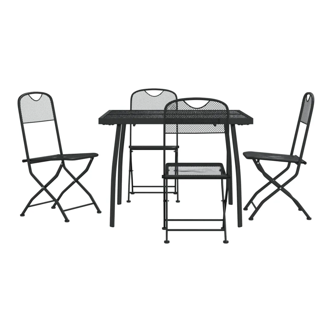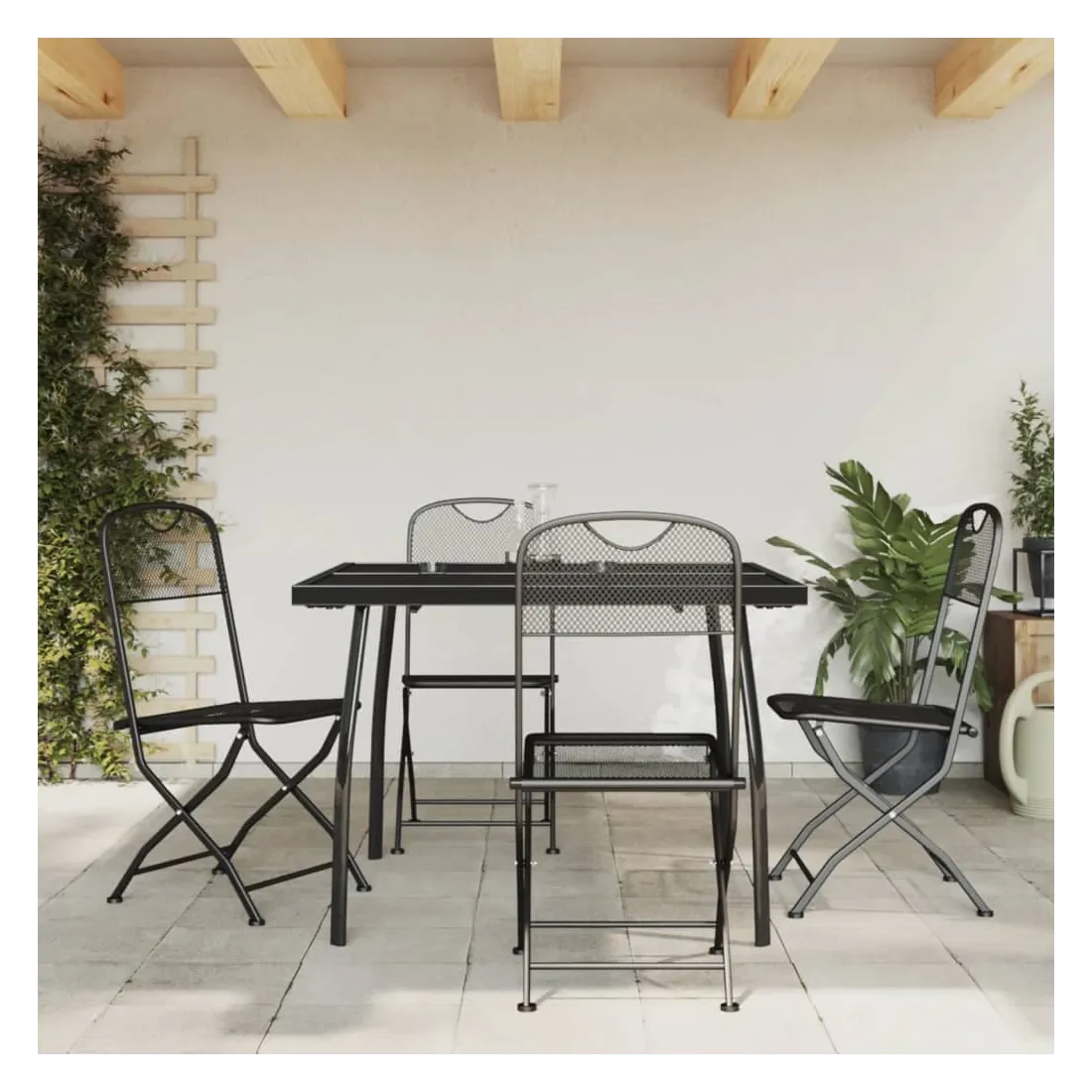 Profitez d'un bon repas ou d'un thé l'après-midi dans votre espace extérieur avec cet ensemble de salle à manger de jardin ! Ayant un design élégant, il deviendra le point central de votre jardin et de votre terrasse ! Cadre robuste : le cadre en métal rend cet ensemble de meubles de jardin robuste et durable, offrant un service à vie.Conception en maille : cet ensemble de salle à manger, avec son design en maille, peut efficacement éviter l'accumulation d'eau, ajoutant une apparence élégante à votre espace de vie extérieur.Dessus de table pratique : le dessus robuste de la table de jardin est parfait pour placer les repas, les boissons et d'autres objets décoratifs.Facile à déplacer : ces chaises à manger de jardin sont pliables pour gagner de la place lorsqu'elles ne sont pas utilisées. Vous pouvez facilement les transporter avec vous lors de vos sorties en plein air. Bon à savoir :Pour que vos meubles d'extérieur restent beaux, nous vous recommandons de les protéger avec une housse imperméable.