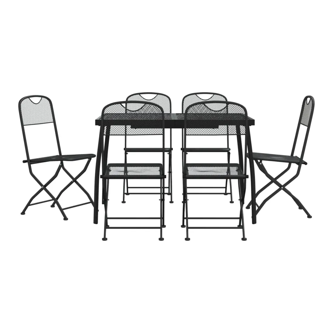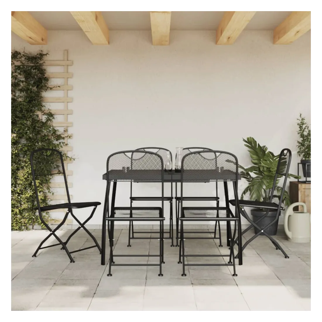 Profitez d'un bon repas ou d'un thé l'après-midi dans votre espace extérieur avec cet ensemble de salle à manger de jardin ! Ayant un design élégant, il deviendra le point central de votre jardin et de votre terrasse ! Cadre robuste : le cadre en métal rend cet ensemble de meubles de jardin robuste et durable, offrant un service à vie.Conception en maille : cet ensemble de salle à manger, avec son design en maille, peut efficacement éviter l'accumulation d'eau, ajoutant une apparence élégante à votre espace de vie extérieur.Dessus de table pratique : le dessus robuste de la table de jardin est parfait pour placer les repas, les boissons et d'autres objets décoratifs.Facile à déplacer : ces chaises à manger de jardin sont pliables pour gagner de la place lorsqu'elles ne sont pas utilisées. Vous pouvez facilement les transporter avec vous lors de vos sorties en plein air. Bon à savoir :Pour que vos meubles d'extérieur restent beaux, nous vous recommandons de les protéger avec une housse imperméable.