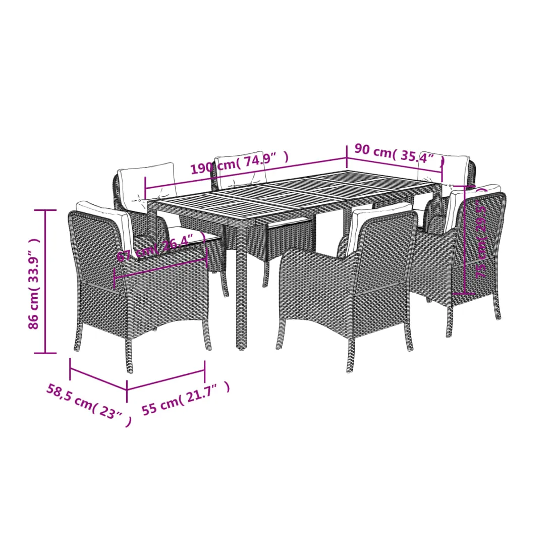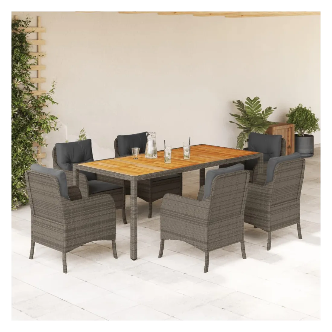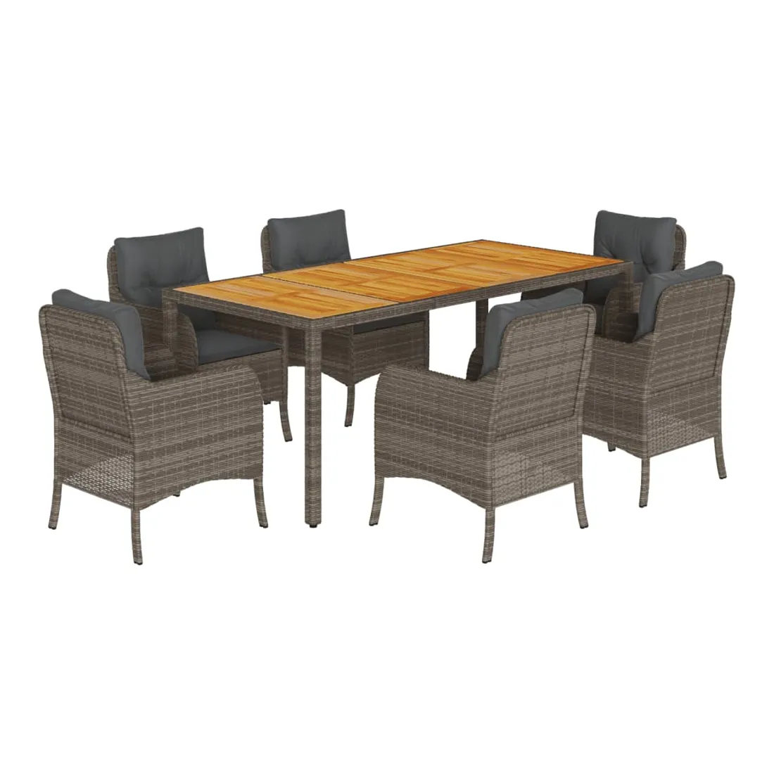Cet ensemble de salle à manger de jardin est un excellent choix pour les repas en plein air ou pour vous détendre dans le jardin, l'arrière-cour ou le patio. Matériau durable : la résine tressée, également connue sous le nom de poly rotin, est un matériau synthétique solide et nécessitant peu d'entretien qui ressemble au rotin naturel. Il est léger, facile à nettoyer et couramment utilisé pour les meubles d'extérieur en raison de sa durabilité et de ses propriétés de résistance aux intempéries.Expérience d'assise confortable : ce mobilier d'extérieur, doté de coussins épais, offre une expérience d'assise confortable.Housse amovible et lavable : ces coussins de siège sont dotés de housses amovibles pour un lavage et un entretien faciles. Les housses de coussin de chaise ont un rabat à l'arrière pour une fixation facile aux chaises.Dessus stable et facile à nettoyer : cette table de jardin a un dessus en bois d'acacia robuste, durable et facile à nettoyer avec un chiffon humide.Cadre robuste et stable : le cadre en acier enduit de poudre assure la solidité et la stabilité du meuble de jardin pour une utilisation quotidienne à l'extérieur. Bon à savoir :Pour que vos meubles d'extérieur restent beaux, nous vous recommandons de les protéger avec une housse imperméable.