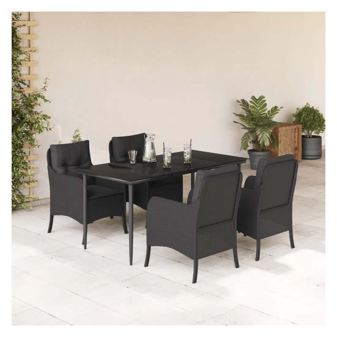 Cet ensemble de salle à manger de jardin est un excellent choix pour les repas en plein air ou pour vous détendre dans le jardin, l'arrière-cour ou le patio. Matériau durable : la résine tressée, également connue sous le nom de poly rotin, est un matériau synthétique solide et nécessitant peu d'entretien qui ressemble au rotin naturel. Il est léger, facile à nettoyer et couramment utilisé pour les meubles d'extérieur en raison de sa durabilité et de ses propriétés de résistance aux intempéries.Expérience d'assise confortable : ce mobilier d'extérieur, doté de coussins épais, offre une expérience d'assise confortable.Housse amovible et lavable : ces coussins de siège sont dotés de housses amovibles pour un lavage et un entretien faciles.Dessus en verre : le dessus de la table d'extérieur est fabriqué en verre trempé solide et durable, ce qui le rend facile à nettoyer avec un chiffon humide et ajoute une touche d'élégance à votre espace extérieur.Cadre robuste et stable : le cadre en acier enduit de poudre assure la solidité et la stabilité du meuble de jardin pour une utilisation quotidienne à l'extérieur. Bon à savoir :Pour que vos meubles d'extérieur restent beaux, nous vous recommandons de les protéger avec une housse imperméable.