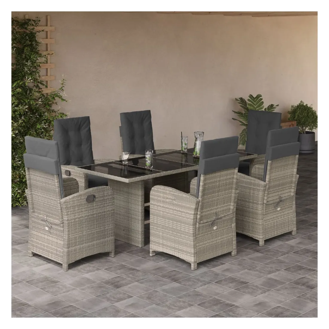 vidaXLCet ensemble de salle à manger de jardin est un excellent choix pour les repas en plein air ou pour vous détendre dans le jardin, dans l'arrière-cour ou sur la terrasse. Matériau durable : la résine tressée, également connue sous le nom de poly rotin, est un matériau synthétique solide et nécessitant peu d'entretien qui ressemble au rotin naturel. Il est léger, facile à nettoyer et couramment utilisé pour les meubles d'extérieur en raison de sa durabilité et de ses propriétés de résistance aux intempéries.Dossier réglable : ce siège de jardin est doté d'une poignée. Vous pouvez régler le dossier dans n'importe quelle position en tirant sur la poignée et le remettre rapidement dans sa position initiale.Expérience d'assise confortable : ce mobilier d'extérieur, doté de coussins épais, offre une expérience d'assise confortable.Housse amovible et lavable : ces coussins de siège sont dotés de housses amovibles pour un lavage et un entretien faciles. Les coussins de dossier ont un rabat à l'arrière pour une fixation facile aux dossiers.Dessus en verre : le dessus de la table d'extérieur est fabriqué en verre trempé solide et durable, ce qui le rend facile à nettoyer avec un chiffon humide et ajoute une touche d'élégance à votre espace extérieur. Bon à savoir :Pour que vos meubles d'extérieur restent beaux, nous vous recommandons de les protéger avec une housse imperméable.