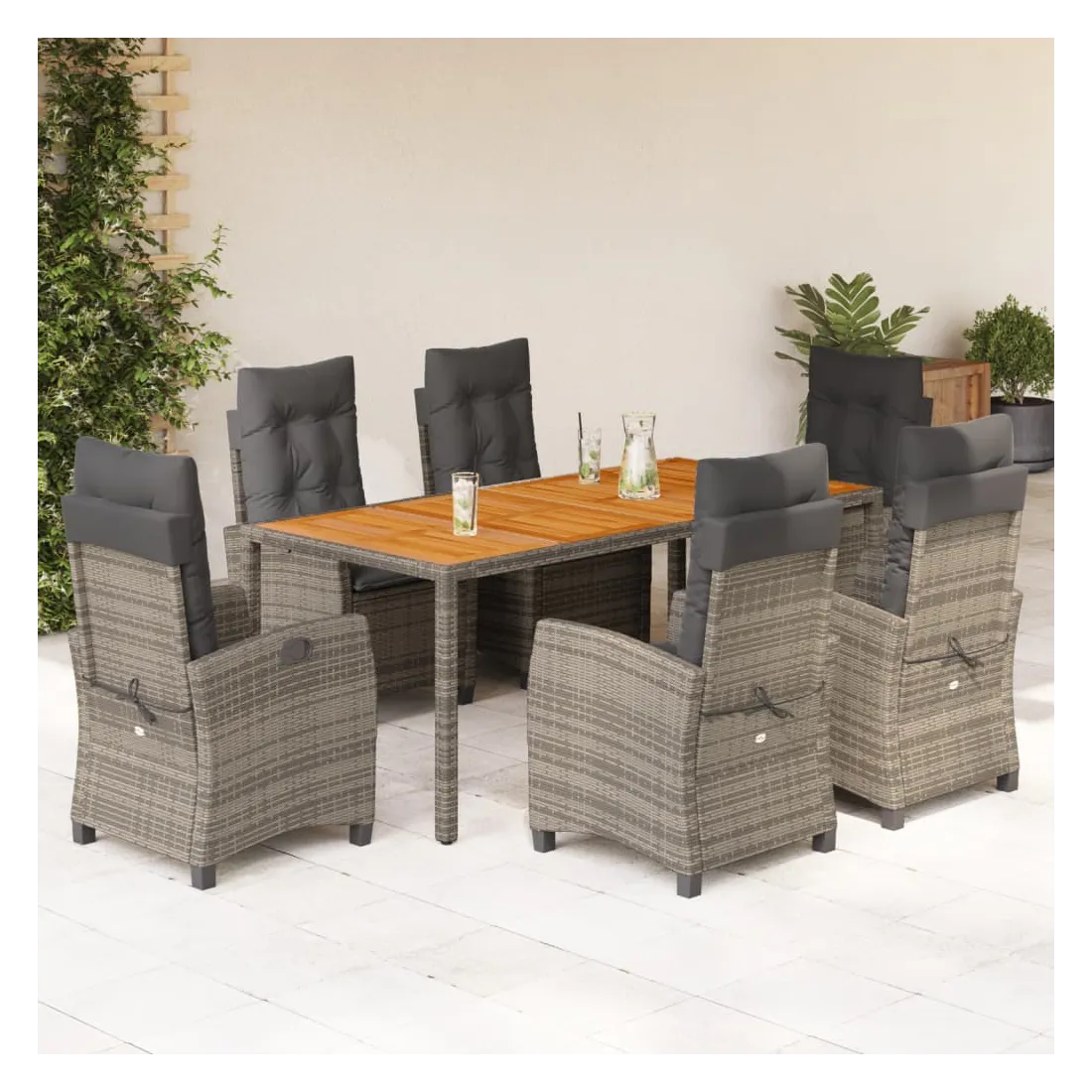 Cet ensemble de salle à manger de jardin est un excellent choix pour les repas en plein air ou pour vous détendre dans le jardin, l'arrière-cour ou le patio. Matériau durable : la résine tressée, également connue sous le nom de poly rotin, est un matériau synthétique solide et nécessitant peu d'entretien qui ressemble au rotin naturel. Il est léger, facile à nettoyer et couramment utilisé pour les meubles d'extérieur en raison de sa durabilité et de ses propriétés de résistance aux intempéries. Dossier réglable : ce siège de jardin est doté d'une poignée. Vous pouvez régler le dossier dans n'importe quelle position en tirant sur la poignée et le remettre rapidement dans sa position initiale.Dessus stable et facile à nettoyer : cette table de jardin a un dessus en bois d'acacia robuste, durable et facile à nettoyer avec un chiffon humide. Expérience d'assise confortable : ce mobilier d'extérieur, doté de coussins épais, offre une expérience d'assise confortable. Housse amovible et lavable : ces coussins de siège sont dotés de housses amovibles pour un lavage et un entretien faciles. Bon à savoir :Pour que vos meubles d'extérieur restent beaux, nous vous recommandons de les protéger avec une housse imperméable.