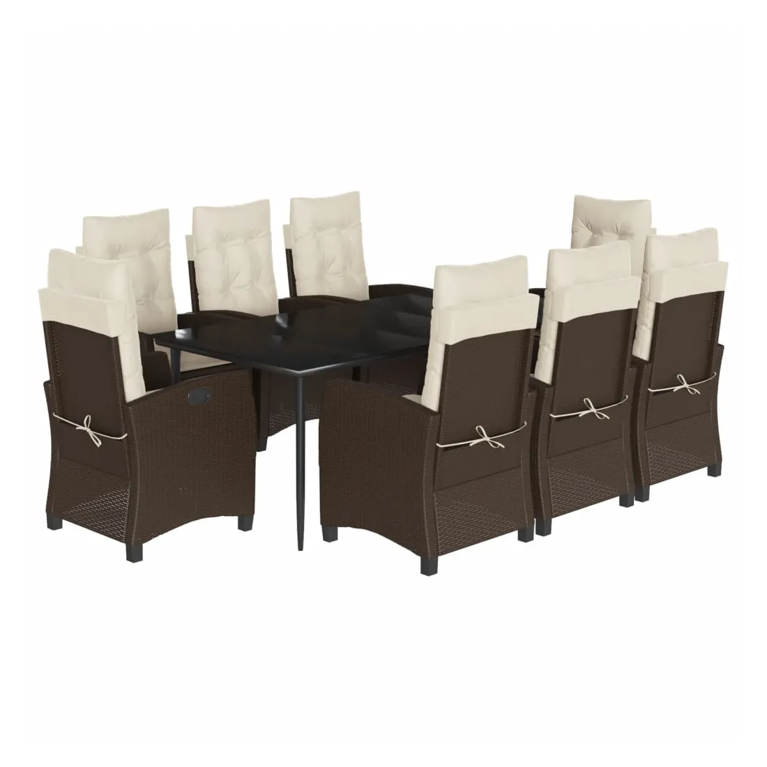 vidaXLCet ensemble de salle à manger de jardin est un excellent choix pour les repas en plein air ou pour vous détendre dans le jardin, l'arrière-cour ou le patio. Matériau durable : la résine tressée, également connue sous le nom de poly rotin, est un matériau synthétique solide et nécessitant peu d'entretien qui ressemble au rotin naturel. Il est léger, facile à nettoyer et couramment utilisé pour les meubles d'extérieur en raison de sa durabilité et de ses propriétés de résistance aux intempéries. Dossier réglable : ce siège de jardin est doté d'une poignée. Vous pouvez régler le dossier dans n'importe quelle position en tirant sur la poignée et le remettre rapidement dans sa position initiale.Dessus en verre : le dessus de la table d'extérieur est fabriqué en verre trempé solide et durable, ce qui le rend facile à nettoyer avec un chiffon humide et ajoute une touche d'élégance à votre espace extérieur. Expérience d'assise confortable : ce mobilier d'extérieur, doté de coussins épais, offre une expérience d'assise confortable. Housse amovible et lavable : ces coussins de siège sont dotés de housses amovibles pour un lavage et un entretien faciles. Bon à savoir :Pour que vos meubles d'extérieur restent beaux, nous vous recommandons de les protéger avec une housse imperméable.