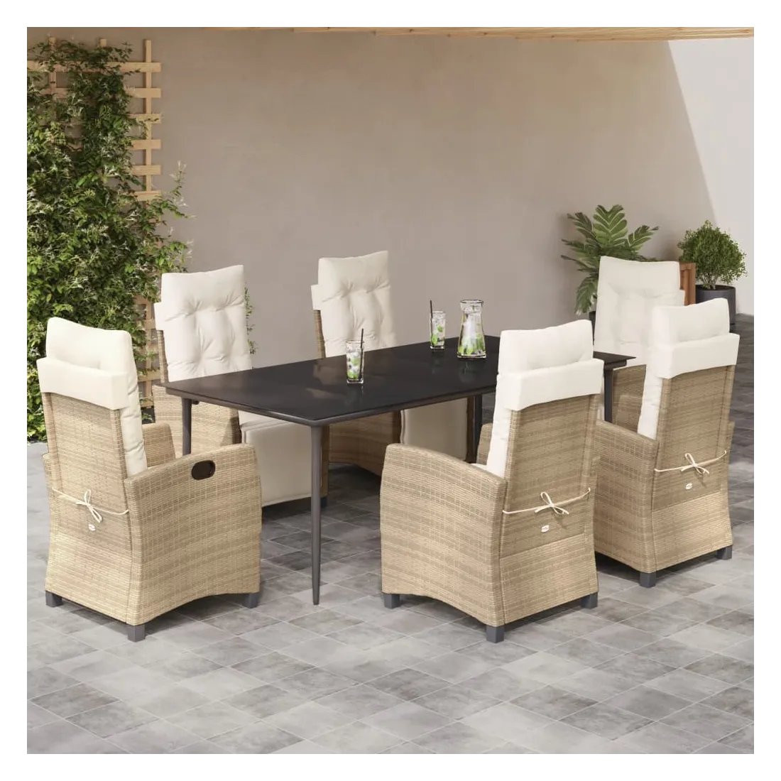 vidaXLCet ensemble de salle à manger de jardin est un excellent choix pour les repas en plein air ou pour vous détendre dans le jardin, l'arrière-cour ou le patio. Matériau durable : la résine tressée, également connue sous le nom de poly rotin, est un matériau synthétique solide et nécessitant peu d'entretien qui ressemble au rotin naturel. Il est léger, facile à nettoyer et couramment utilisé pour les meubles d'extérieur en raison de sa durabilité et de ses propriétés de résistance aux intempéries.Dossier et repose-pied réglables : ce siège de jardin est doté d'une poignée. Vous pouvez régler le dossier et le repose-pied dans n'importe quelle position en tirant sur la poignée, et les remettre rapidement dans leur position initiale.Dessus en verre : le dessus de la table d'extérieur est fabriqué en verre trempé solide et durable, ce qui le rend facile à nettoyer avec un chiffon humide et ajoute une touche d'élégance à votre espace extérieur.Expérience d'assise confortable : ce mobilier d'extérieur, doté de coussins épais, offre une expérience d'assise confortable.Housse amovible et lavable : ces coussins de siège sont dotés de housses amovibles pour un lavage et un entretien faciles. Bon à savoir :Pour que vos meubles d'extérieur restent beaux, nous vous recommandons de les protéger avec une housse imperméable.