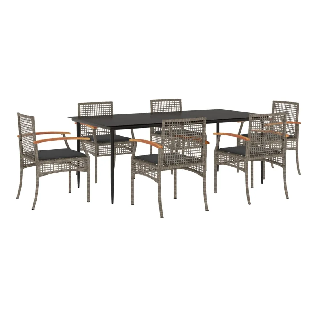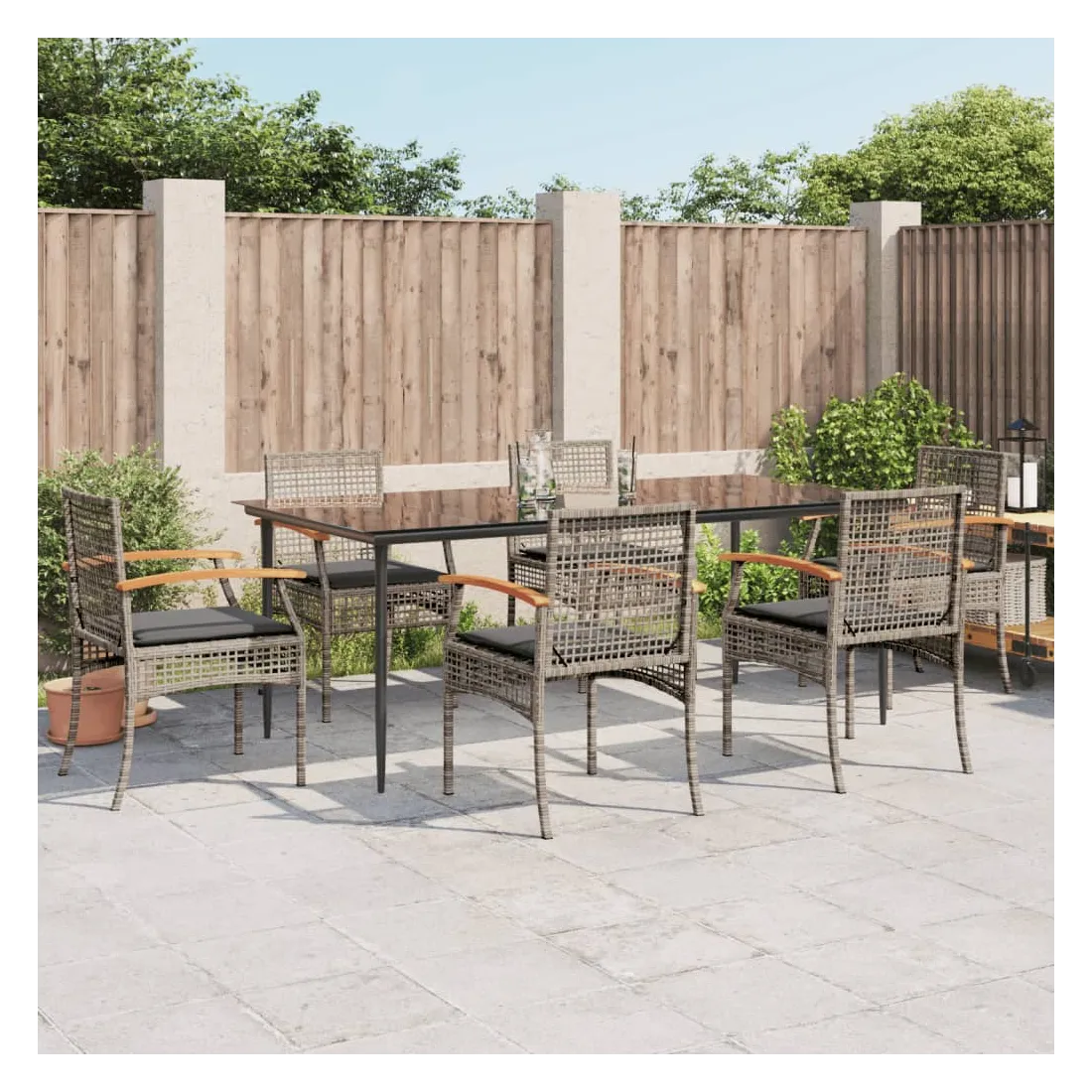 Cet ensemble de salle à manger de jardin est un excellent choix pour les repas en plein air ou pour vous détendre dans le jardin, dans l'arrière-cour ou sur la terrasse. Matériau durable : la résine tressée, également connue sous le nom de poly rotin, est un matériau synthétique solide et nécessitant peu d'entretien qui ressemble au rotin naturel. Il est léger, facile à nettoyer et couramment utilisé pour les meubles d'extérieur en raison de sa durabilité et de ses propriétés de résistance aux intempéries.Expérience d'assise confortable : ce mobilier d'extérieur, doté de coussins épais, offre une expérience d'assise confortable.Housse amovible et lavable : ces coussins de siège sont dotés de housses amovibles pour un lavage et un entretien faciles.Dessus en verre : le dessus de la table d'extérieur est fabriqué en verre trempé solide et durable, ce qui le rend facile à nettoyer avec un chiffon humide et ajoute une touche d'élégance à votre espace extérieur.Cadre robuste et stable : le cadre en acier enduit de poudre assure la solidité et la stabilité du meuble de jardin pour une utilisation quotidienne à l'extérieur. Bon à savoir :Pour que vos meubles d'extérieur restent beaux, nous vous recommandons de les protéger avec une housse imperméable.