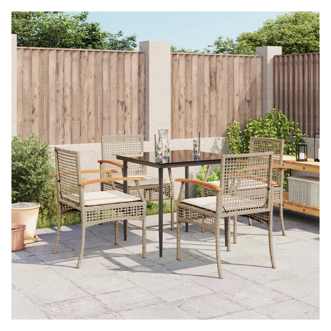 Cet ensemble de salle à manger de jardin est un excellent choix pour les repas en plein air ou pour vous détendre dans le jardin, dans l'arrière-cour ou sur la terrasse. Matériau durable : la résine tressée, également connue sous le nom de poly rotin, est un matériau synthétique solide et nécessitant peu d'entretien qui ressemble au rotin naturel. Il est léger, facile à nettoyer et couramment utilisé pour les meubles d'extérieur en raison de sa durabilité et de ses propriétés de résistance aux intempéries.Expérience d'assise confortable : ce mobilier d'extérieur, doté de coussins épais, offre une expérience d'assise confortable.Housse amovible et lavable : ces coussins de siège sont dotés de housses amovibles pour un lavage et un entretien faciles.Dessus en verre : le dessus de la table d'extérieur est fabriqué en verre trempé solide et durable, ce qui le rend facile à nettoyer avec un chiffon humide et ajoute une touche d'élégance à votre espace extérieur.Cadre robuste et stable : le cadre en acier enduit de poudre assure la solidité et la stabilité du meuble de jardin pour une utilisation quotidienne à l'extérieur. Bon à savoir :Pour que vos meubles d'extérieur restent beaux, nous vous recommandons de les protéger avec une housse imperméable.