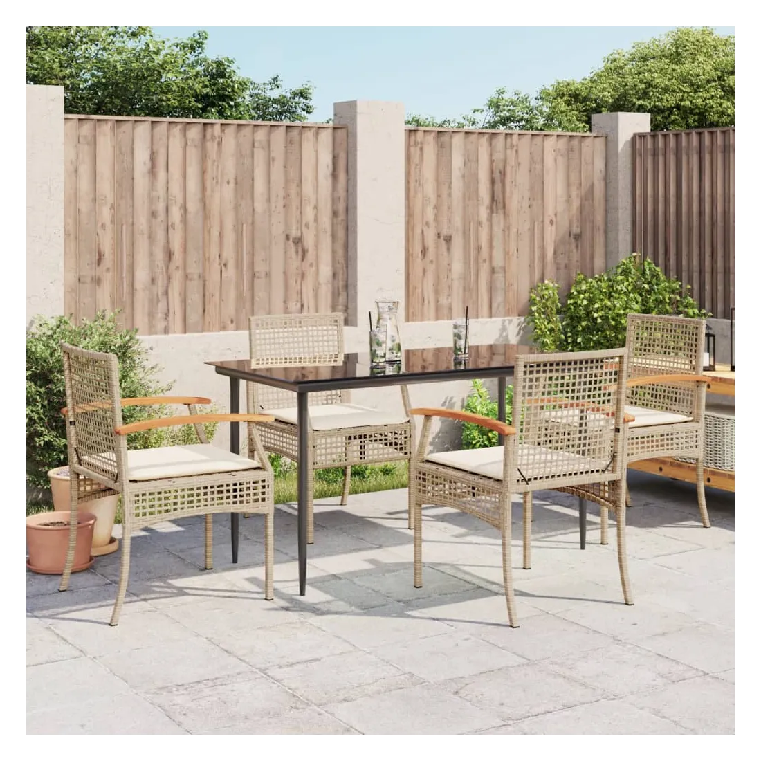 Cet ensemble de salle à manger de jardin est un excellent choix pour les repas en plein air ou pour vous détendre dans le jardin, dans l'arrière-cour ou sur la terrasse. Matériau durable : la résine tressée, également connue sous le nom de poly rotin, est un matériau synthétique solide et nécessitant peu d'entretien qui ressemble au rotin naturel. Il est léger, facile à nettoyer et couramment utilisé pour les meubles d'extérieur en raison de sa durabilité et de ses propriétés de résistance aux intempéries.Expérience d'assise confortable : ce mobilier d'extérieur, doté de coussins épais, offre une expérience d'assise confortable.Housse amovible et lavable : ces coussins de siège sont dotés de housses amovibles pour un lavage et un entretien faciles.Dessus en verre : le dessus de la table d'extérieur est fabriqué en verre trempé solide et durable, ce qui le rend facile à nettoyer avec un chiffon humide et ajoute une touche d'élégance à votre espace extérieur.Cadre robuste et stable : le cadre en acier enduit de poudre assure la solidité et la stabilité du meuble de jardin pour une utilisation quotidienne à l'extérieur. Bon à savoir :Pour que vos meubles d'extérieur restent beaux, nous vous recommandons de les protéger avec une housse imperméable.