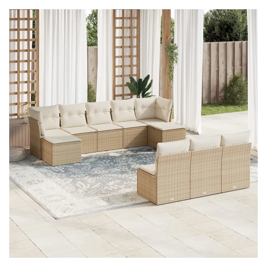 Cet ensemble de canapés de jardin est le complément parfait de votre arrière-cour, terrasse ou patio, offrant un espace confortable et accueillant pour discuter avec la famille et les amis ou simplement se détendre et profiter de l'extérieur. Matériau durable : la résine tressée, également connue sous le nom de poly rotin, est un matériau synthétique solide et nécessitant peu d'entretien qui ressemble au rotin naturel. Il est léger, facile à nettoyer et couramment utilisé pour les meubles d'extérieur en raison de sa durabilité et de ses propriétés de résistance aux intempéries.Expérience d'assise confortable : ce mobilier d'extérieur, doté de coussins épais, offre une expérience d'assise confortable.Housse amovible et lavable : ces coussins de siège sont dotés de housses amovibles pour un lavage et un entretien faciles.Conception modulaire : cet ensemble de meubles d'extérieur a une conception modulaire, ce qui le rend complètement flexible et facile à déplacer, afin que vous puissiez créer un agencement de meubles d'extérieur personnalisé. Bon à savoir :Pour que vos meubles d'extérieur restent beaux, nous vous recommandons de les protéger avec une housse imperméable.