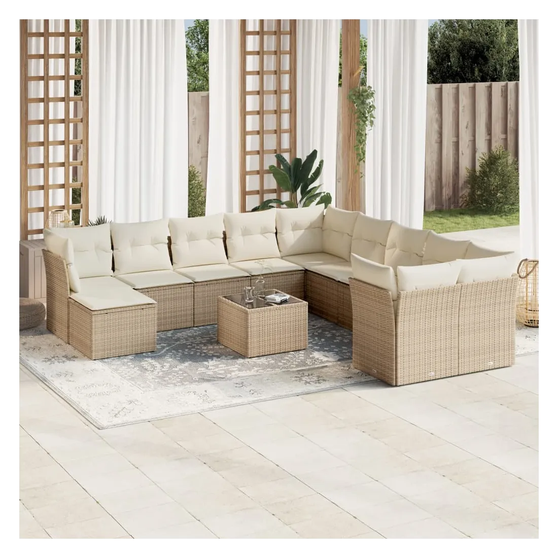 Cet ensemble de canapés de jardin est le complément parfait de votre arrière-cour, terrasse ou patio, offrant un espace confortable et accueillant pour discuter avec la famille et les amis ou simplement se détendre et profiter de l'extérieur. Matériau durable : la résine tressée, également connue sous le nom de poly rotin, est un matériau synthétique solide et nécessitant peu d'entretien qui ressemble au rotin naturel. Il est léger, facile à nettoyer et couramment utilisé pour les meubles d'extérieur en raison de sa durabilité et de ses propriétés de résistance aux intempéries.Expérience d'assise confortable : ce mobilier d'extérieur, doté de coussins épais, offre une expérience d'assise confortable.Housse amovible et lavable : ces coussins de siège sont dotés de housses amovibles pour un lavage et un entretien faciles.Dessus en verre : le dessus de la table d'extérieur est fabriqué en verre trempé solide et durable, ce qui le rend facile à nettoyer avec un chiffon humide et ajoute une touche d'élégance à votre espace extérieur.Conception modulaire : cet ensemble de meubles d'extérieur a une conception modulaire, ce qui le rend complètement flexible et facile à déplacer, afin que vous puissiez créer un agencement de meubles d'extérieur personnalisé. Bon à savoir :Pour que vos meubles d'extérieur restent beaux, nous vous recommandons de les protéger avec une housse imperméable.