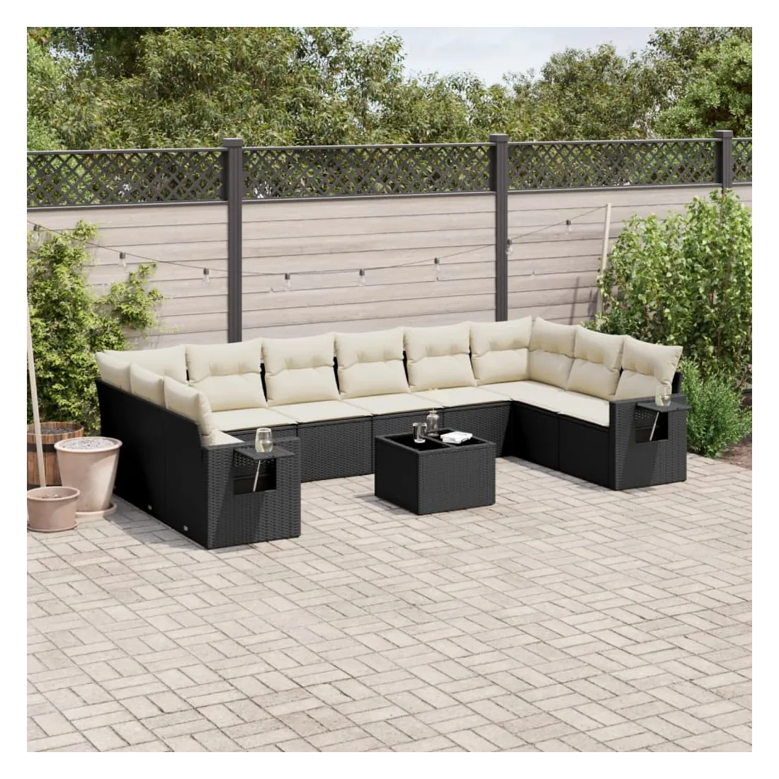 Cet ensemble de canapés de jardin est le complément parfait de votre arrière-cour, terrasse ou patio, offrant un espace confortable et accueillant pour discuter avec la famille et les amis ou simplement se détendre et profiter de l'extérieur. Matériau durable : la résine tressée, également connue sous le nom de poly rotin, est un matériau synthétique solide et nécessitant peu d'entretien qui ressemble au rotin naturel. Il est léger, facile à nettoyer et couramment utilisé pour les meubles d'extérieur en raison de sa durabilité et de ses propriétés de résistance aux intempéries.Dessus en verre : le dessus de la table d'extérieur est fabriqué en verre trempé solide et durable, ce qui le rend facile à nettoyer avec un chiffon humide et ajoute une touche d'élégance à votre espace extérieur. Table d'appoint pratique : ce mobilier d'extérieur comprend des tables d'appoint pliables avec un ressort à gaz sur les accoudoirs, offrant des endroits pratiques pour garder vos essentiels à portée de main. Expérience d'assise confortable : ce mobilier d'extérieur, doté de coussins épais, offre une expérience d'assise confortable.Conception modulaire : cet ensemble de meubles d'extérieur a une conception modulaire, ce qui le rend complètement flexible et facile à déplacer, afin que vous puissiez créer un agencement de meubles d'extérieur personnalisé. Bon à savoir :Pour que vos meubles d'extérieur restent beaux, nous vous recommandons de les protéger avec une housse imperméable.
