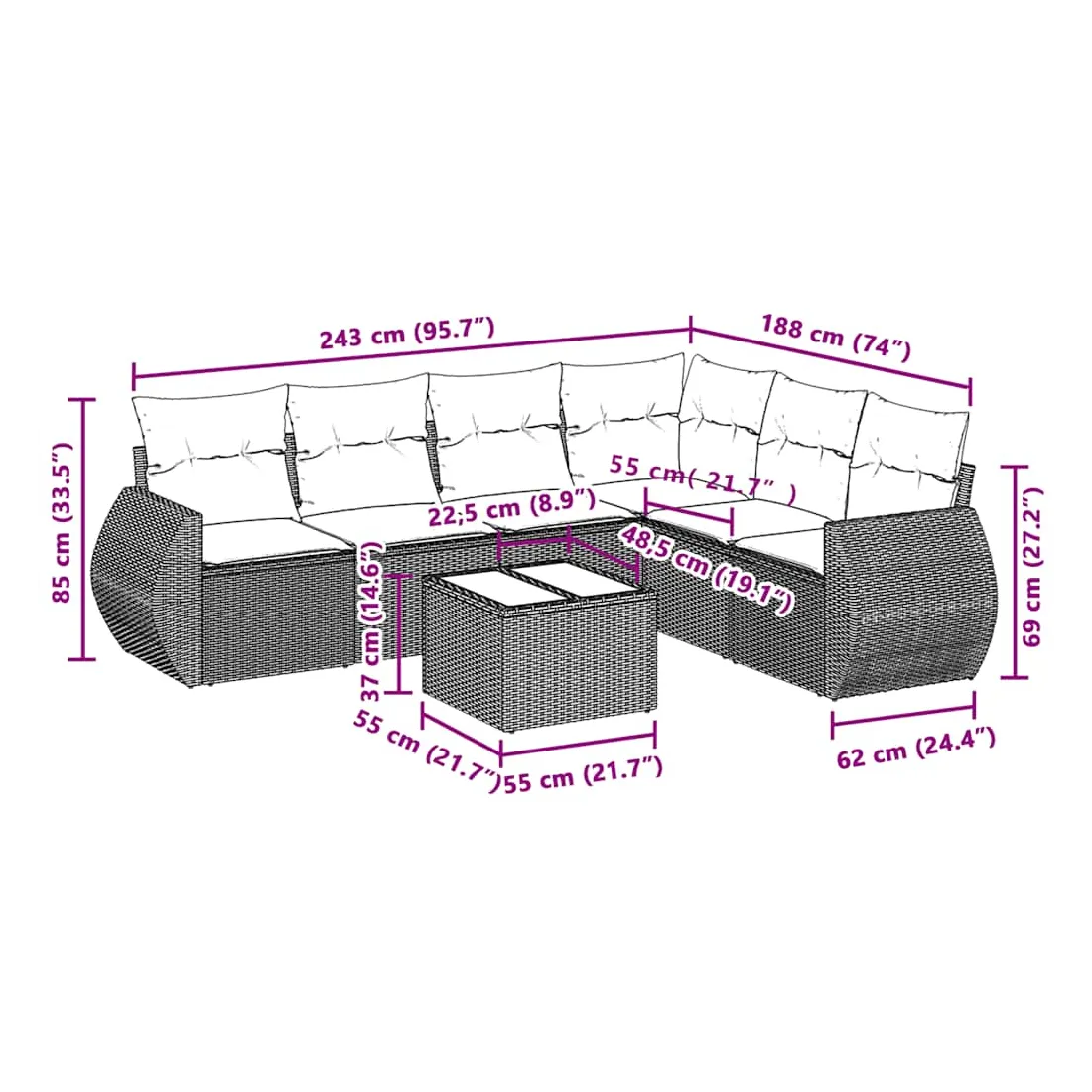 - Dimensions du coussin de siège : 55 x 55 x 3 cm (l x P x é)