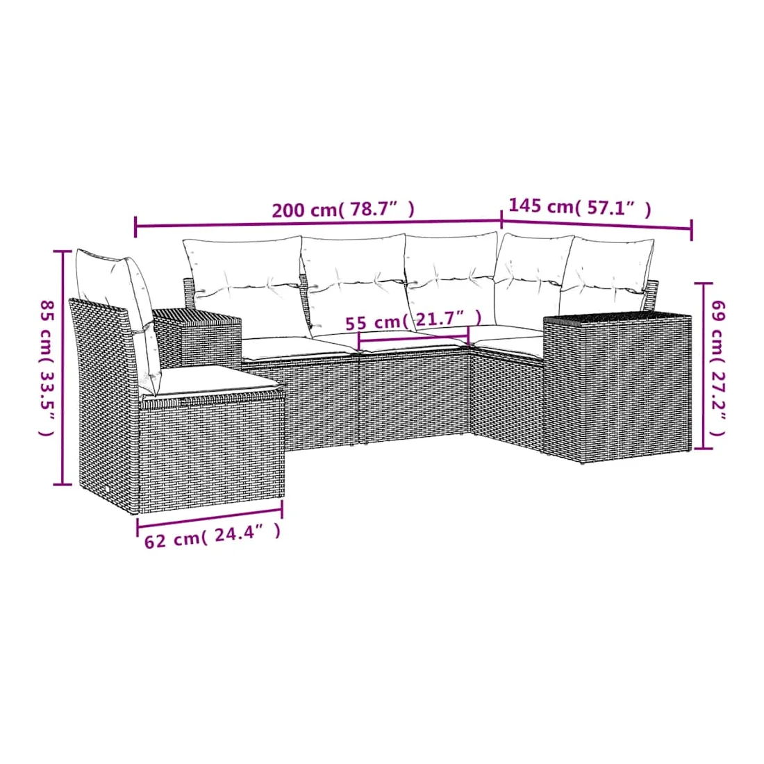 Cet ensemble de canapés de jardin est le complément parfait de votre arrière-cour, terrasse ou patio, offrant un espace confortable et accueillant pour discuter avec la famille et les amis ou simplement se détendre et profiter de l'extérieur. Matériau durable : la résine tressée, également connue sous le nom de poly rotin, est un matériau synthétique solide et nécessitant peu d'entretien qui ressemble au rotin naturel. Il est léger, facile à nettoyer et couramment utilisé pour les meubles d'extérieur en raison de sa durabilité et de ses propriétés de résistance aux intempéries.Expérience d'assise confortable : ce mobilier d'extérieur, doté de coussins épais, offre une expérience d'assise confortable.Housse amovible et lavable : ces coussins de siège sont dotés de housses amovibles pour un lavage et un entretien faciles.Conception modulaire : cet ensemble de meubles d'extérieur a une conception modulaire, ce qui le rend complètement flexible et facile à déplacer, afin que vous puissiez créer un agencement de meubles d'extérieur personnalisé. Bon à savoir :Pour que vos meubles d'extérieur restent beaux, nous vous recommandons de les protéger avec une housse imperméable.