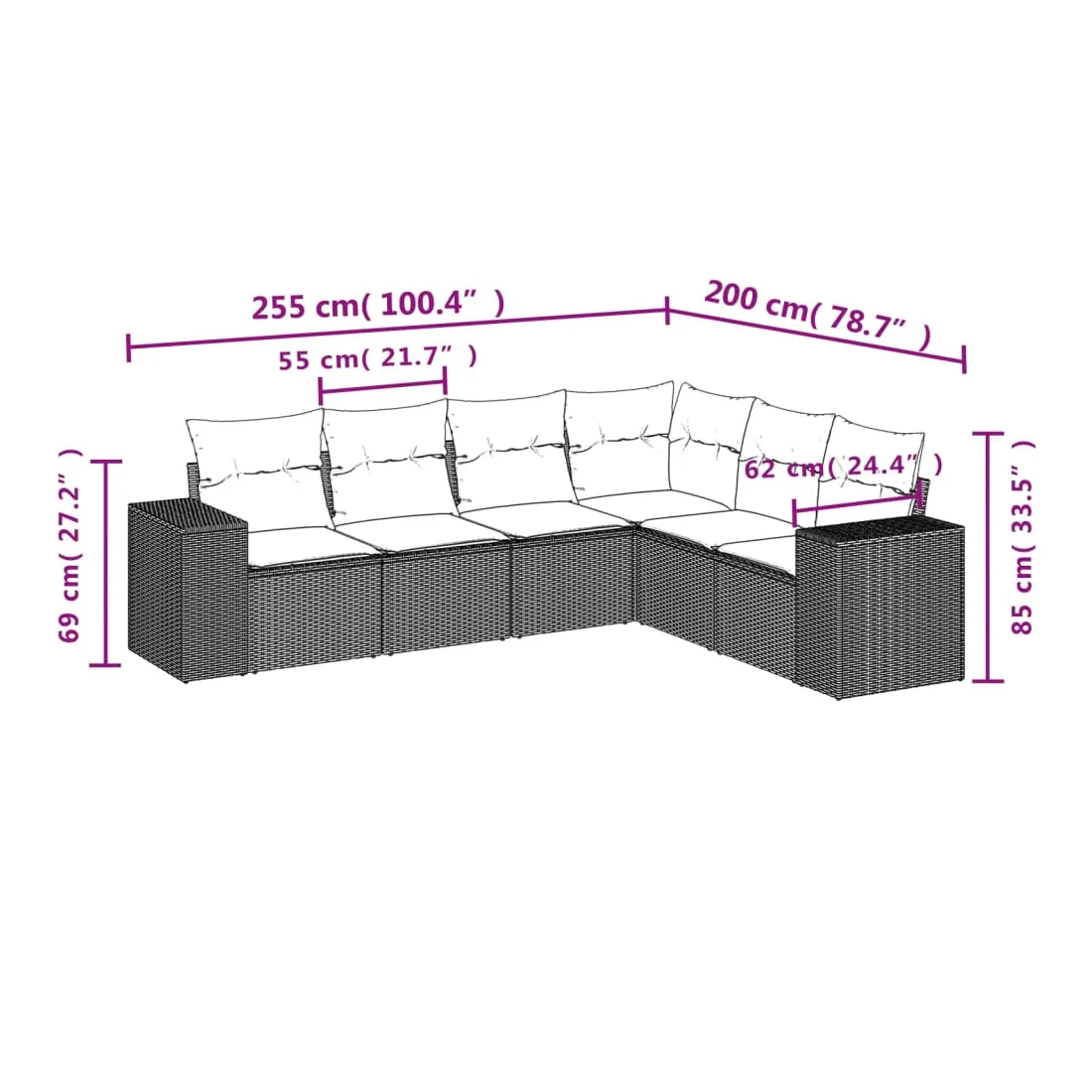 Cet ensemble de canapés de jardin est le complément parfait de votre arrière-cour, terrasse ou patio, offrant un espace confortable et accueillant pour discuter avec la famille et les amis ou simplement se détendre et profiter de l'extérieur. Matériau durable : la résine tressée, également connue sous le nom de poly rotin, est un matériau synthétique solide et nécessitant peu d'entretien qui ressemble au rotin naturel. Il est léger, facile à nettoyer et couramment utilisé pour les meubles d'extérieur en raison de sa durabilité et de ses propriétés de résistance aux intempéries.Expérience d'assise confortable : ce mobilier d'extérieur, doté de coussins épais, offre une expérience d'assise confortable.Housse amovible et lavable : ces coussins de siège sont dotés de housses amovibles pour un lavage et un entretien faciles.Conception modulaire : cet ensemble de meubles d'extérieur a une conception modulaire, ce qui le rend complètement flexible et facile à déplacer, afin que vous puissiez créer un agencement de meubles d'extérieur personnalisé. Bon à savoir :Pour que vos meubles d'extérieur restent beaux, nous vous recommandons de les protéger avec une housse imperméable.