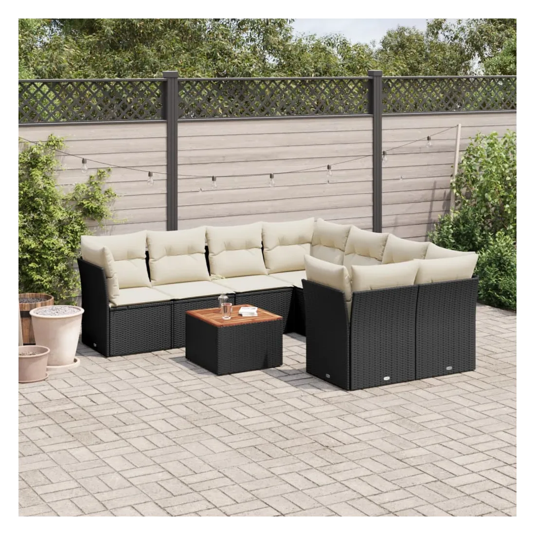 Cet ensemble de canapés de jardin est le complément parfait de votre arrière-cour, terrasse ou patio, offrant un espace confortable et accueillant pour discuter avec la famille et les amis ou simplement se détendre et profiter de l'extérieur. Matériau durable : la résine tressée, également connue sous le nom de poly rotin, est un matériau synthétique solide et nécessitant peu d'entretien qui ressemble au rotin naturel. Il est léger, facile à nettoyer et couramment utilisé pour les meubles d'extérieur en raison de sa durabilité et de ses propriétés de résistance aux intempéries.Expérience d'assise confortable : ce mobilier d'extérieur, doté de coussins épais, offre une expérience d'assise confortable.Dessus stable et facile à nettoyer : cette table de jardin a un dessus en bois d'acacia robuste, durable et facile à nettoyer avec un chiffon humide.Housse amovible et lavable : ces coussins de siège sont dotés de housses amovibles pour un lavage et un entretien faciles.Conception modulaire : cet ensemble de meubles d'extérieur a une conception modulaire, ce qui le rend complètement flexible et facile à déplacer, afin que vous puissiez créer un agencement de meubles d'extérieur personnalisé. Bon à savoir :Pour que vos meubles d'extérieur restent beaux, nous vous recommandons de les protéger avec une housse imperméable.