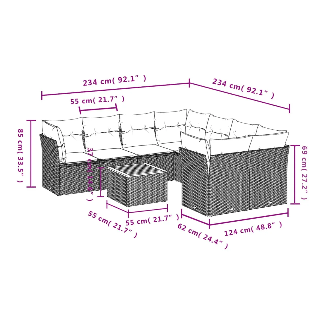 - Dimensions du coussin de siège : 55 x 55 x 3 cm (l x P x é)