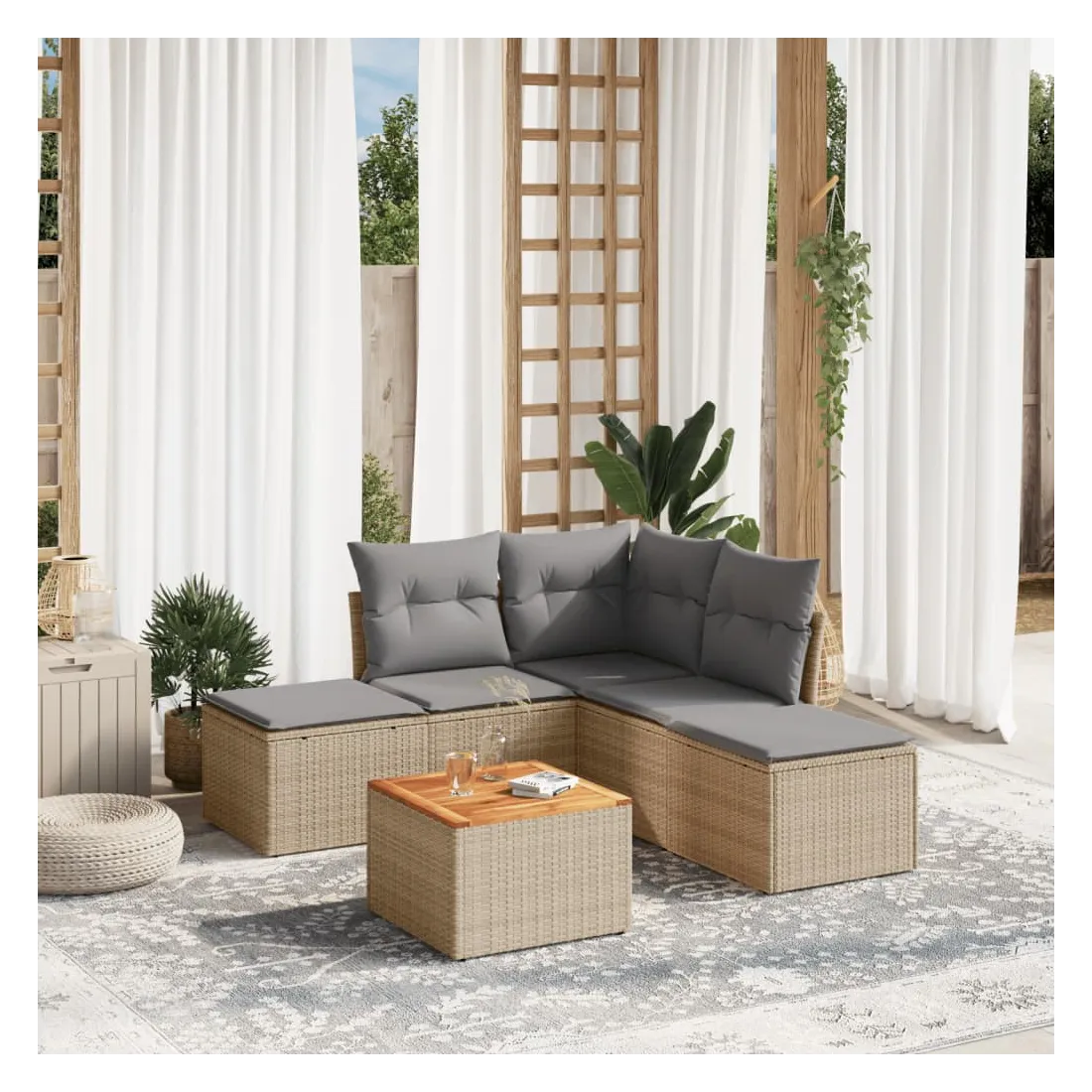 Cet ensemble de canapés de jardin est le complément parfait de votre arrière-cour, terrasse ou patio, offrant un espace confortable et accueillant pour discuter avec la famille et les amis ou simplement se détendre et profiter de l'extérieur. Matériau durable : la résine tressée, également connue sous le nom de poly rotin, est un matériau synthétique solide et nécessitant peu d'entretien qui ressemble au rotin naturel. Il est léger, facile à nettoyer et couramment utilisé pour les meubles d'extérieur en raison de sa durabilité et de ses propriétés de résistance aux intempéries.Expérience d'assise confortable : ce mobilier d'extérieur, doté de coussins épais, offre une expérience d'assise confortable.Dessus stable et facile à nettoyer : cette table de jardin a un dessus en bois d'acacia robuste, durable et facile à nettoyer avec un chiffon humide.Housse amovible et lavable : ces coussins de siège sont dotés de housses amovibles pour un lavage et un entretien faciles.Conception modulaire : cet ensemble de meubles d'extérieur a une conception modulaire, ce qui le rend complètement flexible et facile à déplacer, afin que vous puissiez créer un agencement de meubles d'extérieur personnalisé. Bon à savoir :Pour que vos meubles d'extérieur restent beaux, nous vous recommandons de les protéger avec une housse imperméable.