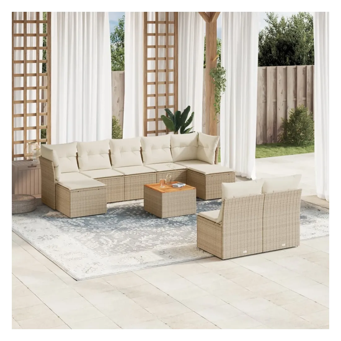 Cet ensemble de canapés de jardin est le complément parfait de votre arrière-cour, terrasse ou patio, offrant un espace confortable et accueillant pour discuter avec la famille et les amis ou simplement se détendre et profiter de l'extérieur. Matériau durable : la résine tressée, également connue sous le nom de poly rotin, est un matériau synthétique solide et nécessitant peu d'entretien qui ressemble au rotin naturel. Il est léger, facile à nettoyer et couramment utilisé pour les meubles d'extérieur en raison de sa durabilité et de ses propriétés de résistance aux intempéries.Expérience d'assise confortable : ce mobilier d'extérieur, doté de coussins épais, offre une expérience d'assise confortable.Dessus stable et facile à nettoyer : cette table de jardin a un dessus en bois d'acacia robuste, durable et facile à nettoyer avec un chiffon humide.Housse amovible et lavable : ces coussins de siège sont dotés de housses amovibles pour un lavage et un entretien faciles.Conception modulaire : cet ensemble de meubles d'extérieur a une conception modulaire, ce qui le rend complètement flexible et facile à déplacer, afin que vous puissiez créer un agencement de meubles d'extérieur personnalisé. Bon à savoir :Pour que vos meubles d'extérieur restent beaux, nous vous recommandons de les protéger avec une housse imperméable.