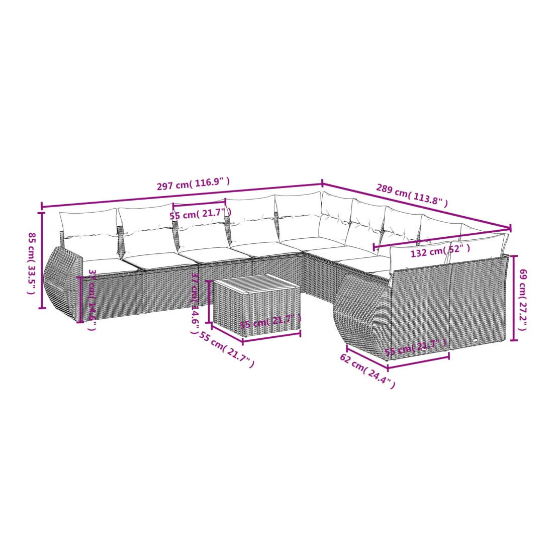 • Dimensions du coussin de siège : 55 x 55 x 3 cm (l x P x é)