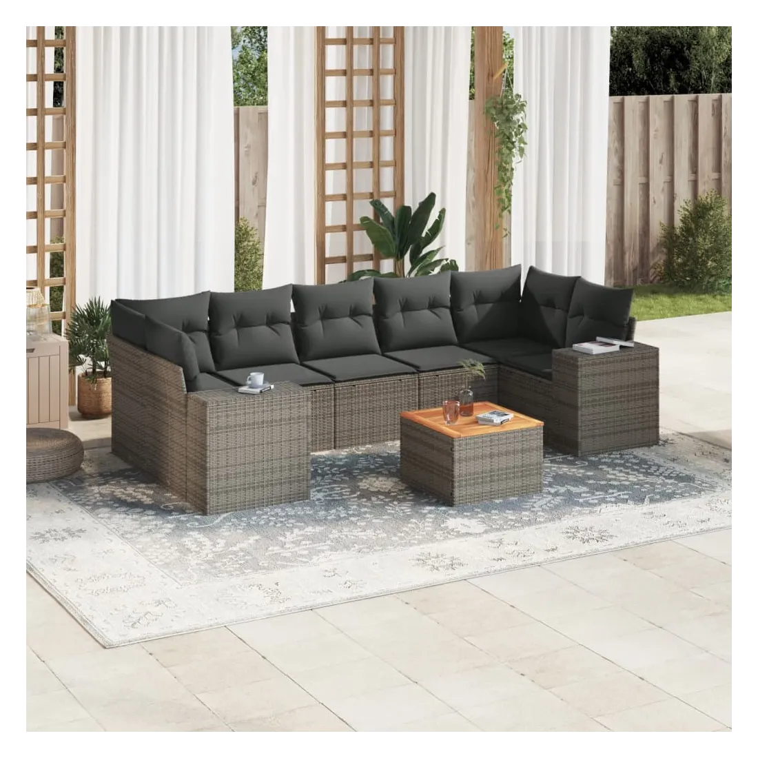 Cet ensemble de canapés de jardin est le complément parfait de votre arrière-cour, terrasse ou patio, offrant un espace confortable et accueillant pour discuter avec la famille et les amis ou simplement se détendre et profiter de l'extérieur. Matériau durable : la résine tressée, également connue sous le nom de poly rotin, est un matériau synthétique solide et nécessitant peu d'entretien qui ressemble au rotin naturel. Il est léger, facile à nettoyer et couramment utilisé pour les meubles d'extérieur en raison de sa durabilité et de ses propriétés de résistance aux intempéries.Dessus stable et facile à nettoyer : cette table de jardin a un dessus en bois d'acacia robuste, durable et facile à nettoyer avec un chiffon humide. Expérience d'assise confortable : ce mobilier d'extérieur, doté de coussins épais, offre une expérience d'assise confortable. Housse amovible et lavable : ces coussins de siège sont dotés de housses amovibles pour un lavage et un entretien faciles.Conception modulaire : cet ensemble de meubles d'extérieur a une conception modulaire, ce qui le rend complètement flexible et facile à déplacer, afin que vous puissiez créer un agencement de meubles d'extérieur personnalisé. Bon à savoir :Pour que vos meubles d'extérieur restent beaux, nous vous recommandons de les protéger avec une housse imperméable.