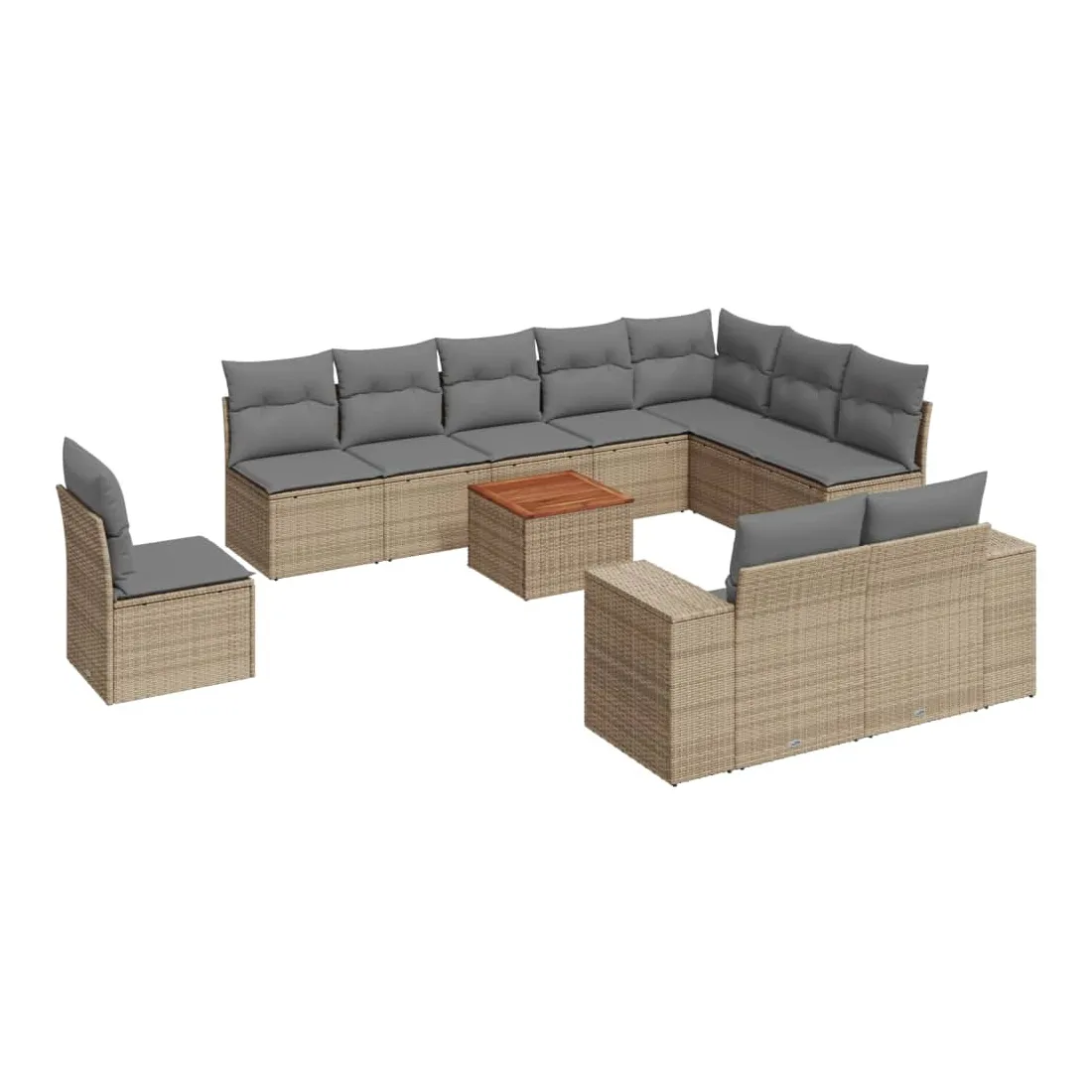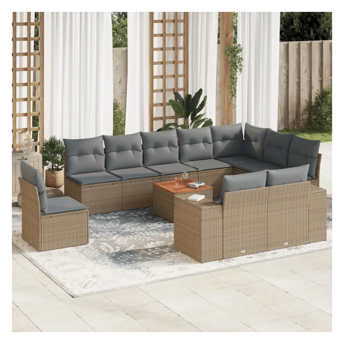 Cet ensemble de canapés de jardin est le complément parfait de votre arrière-cour, terrasse ou patio, offrant un espace confortable et accueillant pour discuter avec la famille et les amis ou simplement se détendre et profiter de l'extérieur. Matériau durable : la résine tressée, également connue sous le nom de poly rotin, est un matériau synthétique solide et nécessitant peu d'entretien qui ressemble au rotin naturel. Il est léger, facile à nettoyer et couramment utilisé pour les meubles d'extérieur en raison de sa durabilité et de ses propriétés de résistance aux intempéries.Dessus stable et facile à nettoyer : cette table de jardin a un dessus en bois d'acacia robuste, durable et facile à nettoyer avec un chiffon humide. Expérience d'assise confortable : ce mobilier d'extérieur, doté de coussins épais, offre une expérience d'assise confortable. Housse amovible et lavable : ces coussins de siège sont dotés de housses amovibles pour un lavage et un entretien faciles.Conception modulaire : cet ensemble de meubles d'extérieur a une conception modulaire, ce qui le rend complètement flexible et facile à déplacer, afin que vous puissiez créer un agencement de meubles d'extérieur personnalisé. Bon à savoir :Pour que vos meubles d'extérieur restent beaux, nous vous recommandons de les protéger avec une housse imperméable.